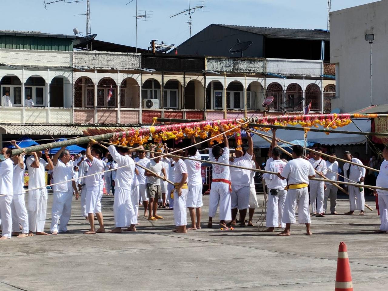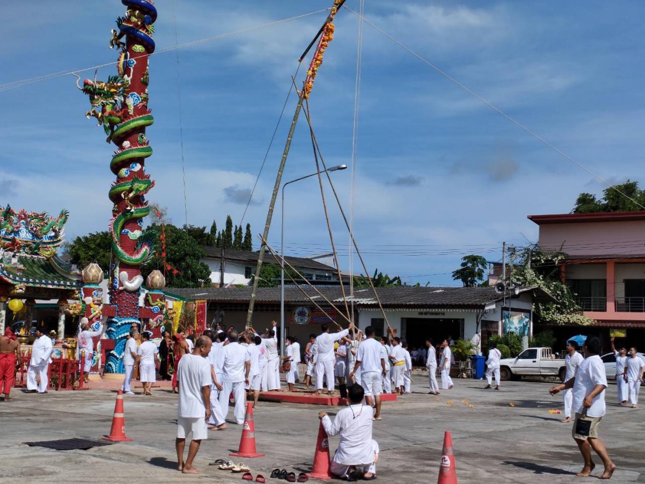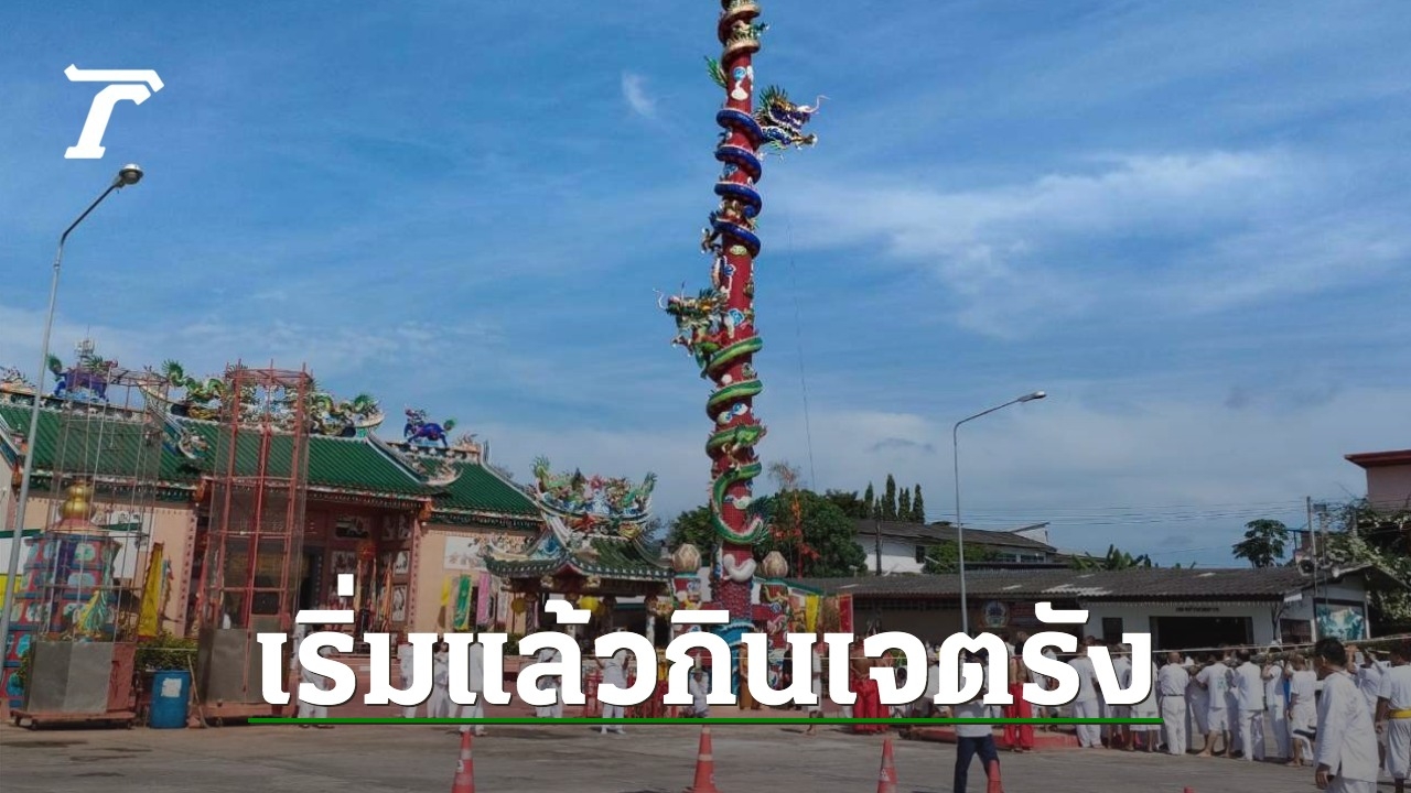 กินเจเริ่มแล้ว 2 ศาลเจ้าใหญ่ใน จ.ตรัง ทำพิธียกเสา "เต็งโก" หรือขึ้นเสาเทวดา เพื่อประกาศว่าประเพณีถือศีลกินผักได้เริ่มขึ้นแล้ว โดยมีชาวไทยเชื้อสายจีนสวมใส่ชุดขาวเข้าร่วมพิธี แต่บรรยากาศปีนี้ประชาชนค่อนข้างบางตา เพราะต้องไปวัดในงานบุญสารทเดือนสิบเพื่อร่วมส่งตายาย