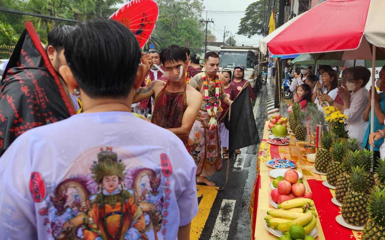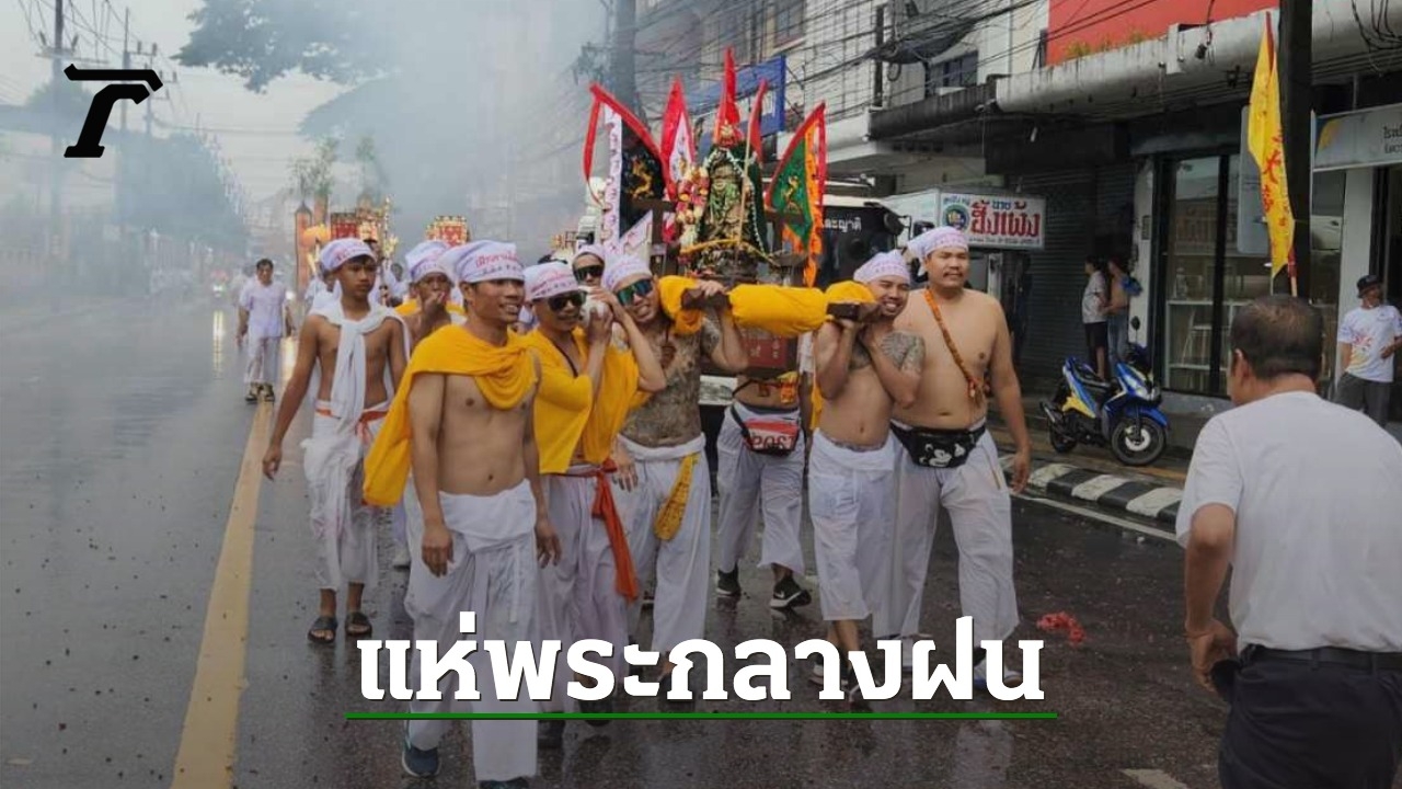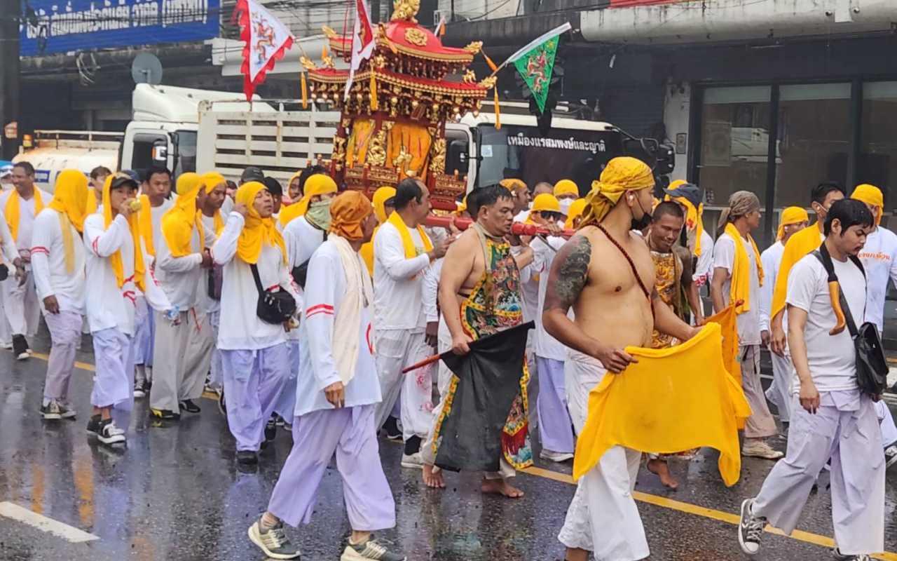 ขบวนแห่พระรอบเมือง อ๊ามสะปำ-บางคู ประเพณีถือศีลกินผัก จ.ภูเก็ต วันที่ 3 คึกคัก มีประชาชน นักท่องเที่ยว รวมทั้งผู้ถือศีลกินเจ แต่งกายด้วยชุดสีขาว รอรับพระ ตลอดเส้นทาง ท่ามกลางสายฝนโปรยปราย
