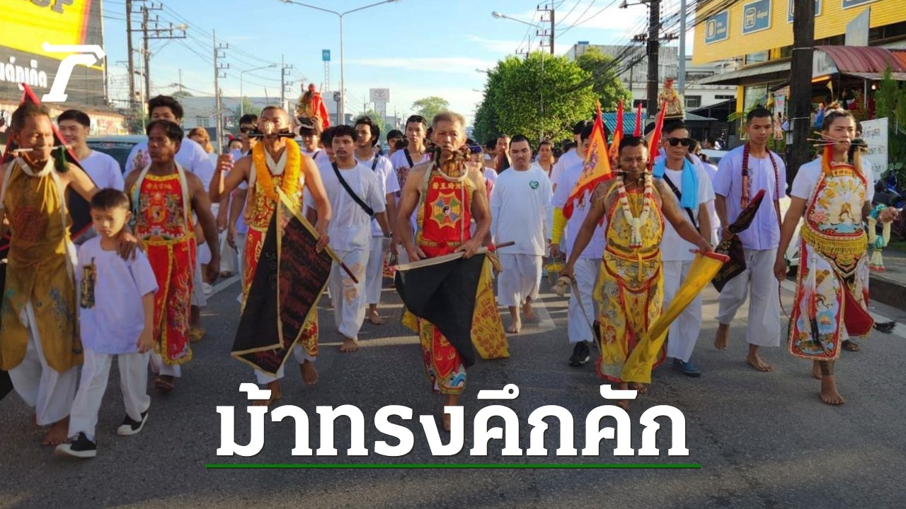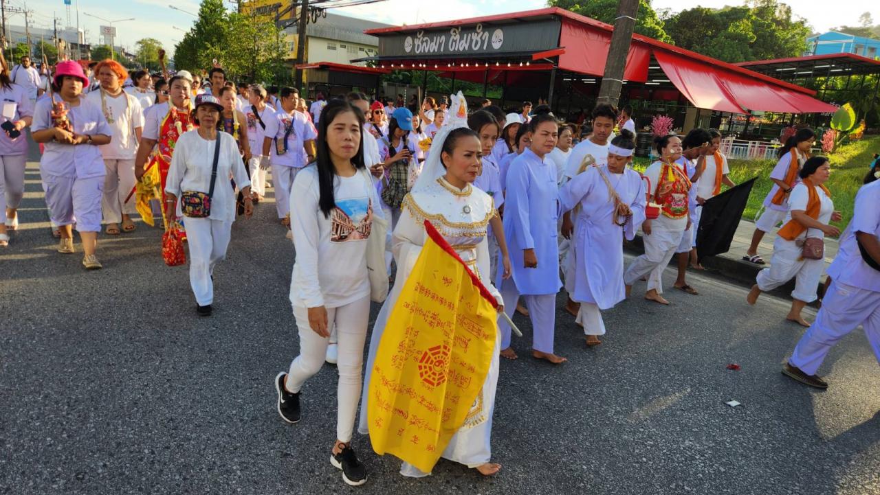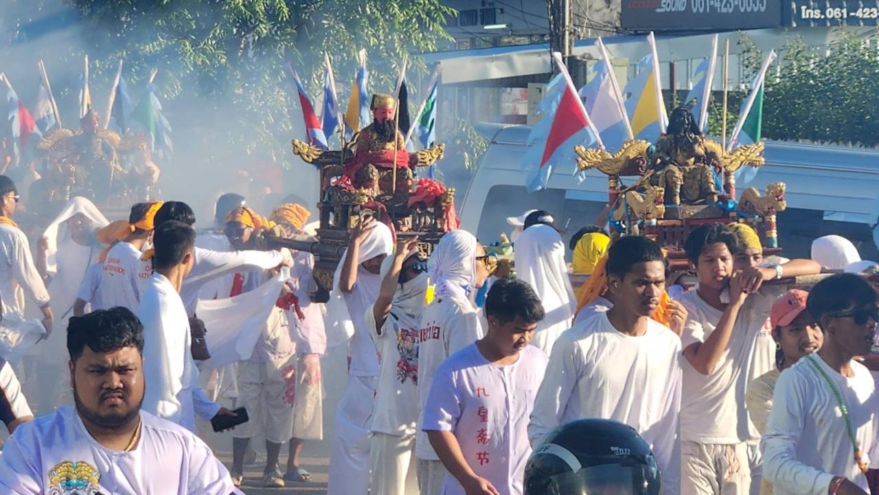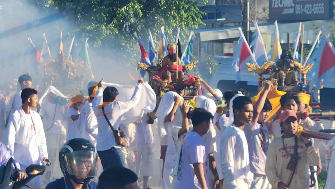 กินเจภูเก็ต เข้าสู่วันที่ 4 ศาลเจ้าท่าเรือ-ศาลเจ้าเจ่งอ๋อง แห่พระรอบเมือง ม้าทรงชาย-หญิงยังแสดงอิทธิฤทธิ์ใช้เหล็กแหลมทิ่มแทงตามร่างกาย เพื่อเป็นการรับเคราะห์แทนประชาชน โดยมีผู้รอรับขบวนจำนวนมาก ทั้งนี้สองข้างทางกระหึ่มด้วยเสียงประทัด