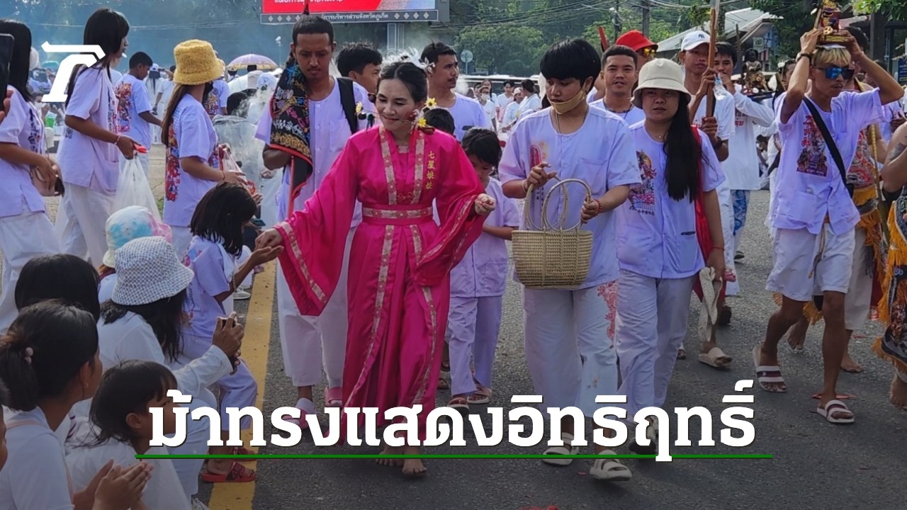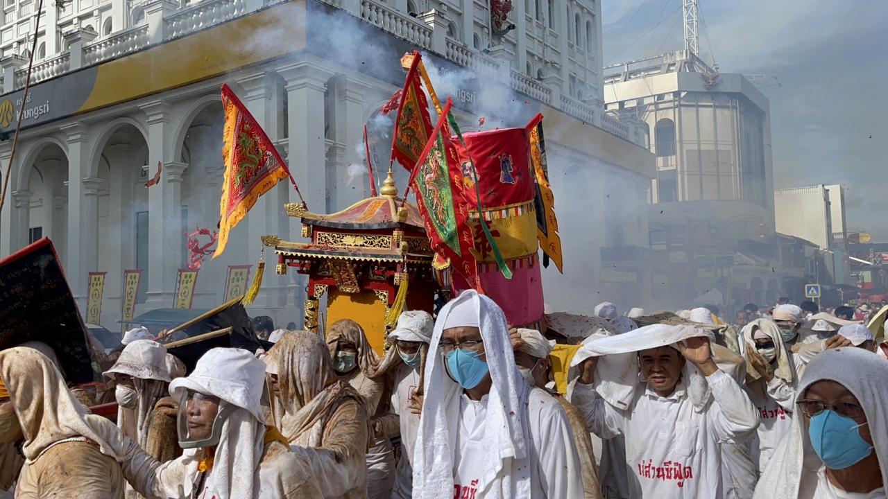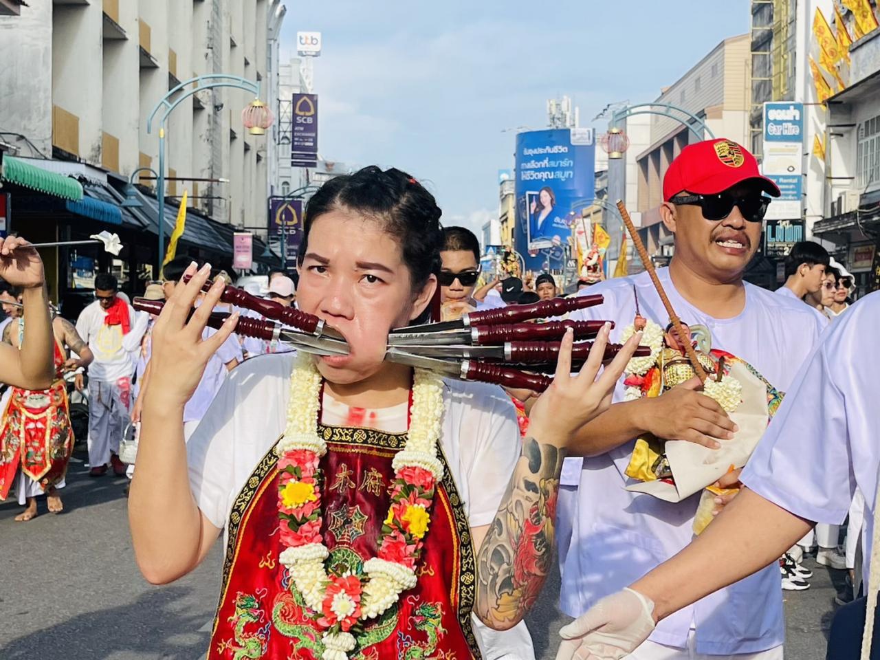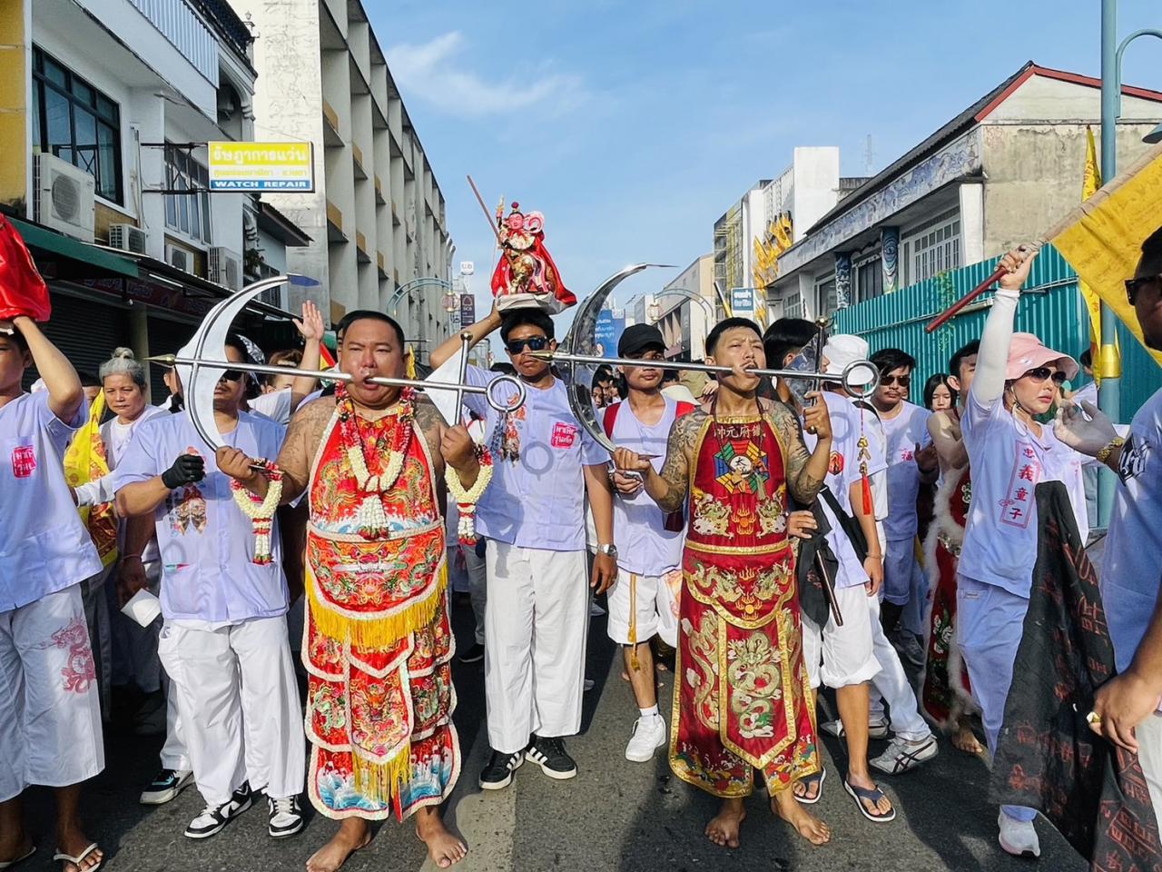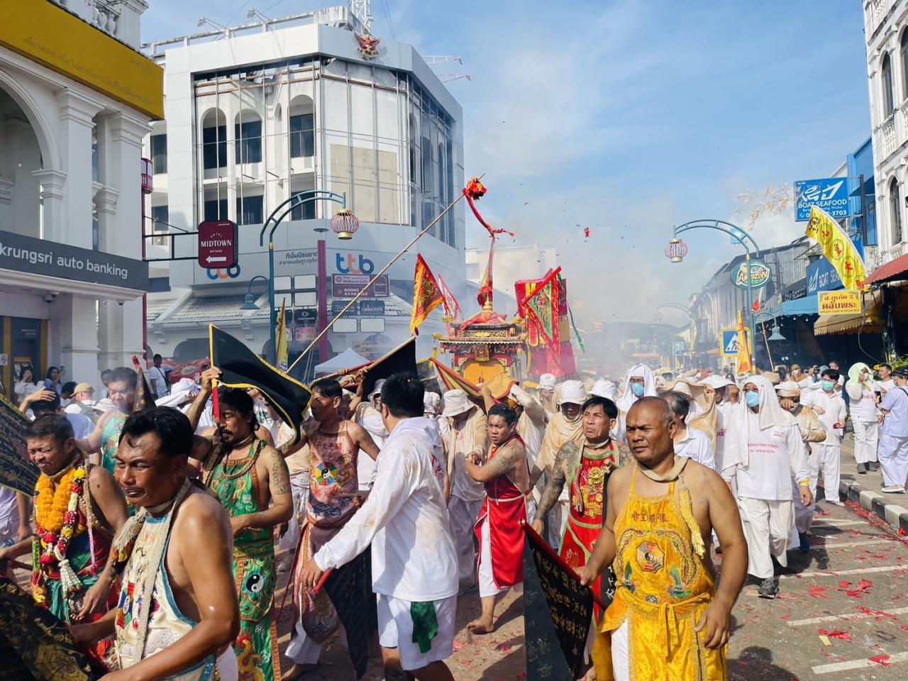 กินเจภูเก็ต เข้าสู่วันที่ 7 ม้าทรงชาย-หญิง กว่า 2 พันคนยังเดินแสดงอิทธิฤทธิ์ทิ่มแทงรับเคราะห์แทนผู้ถือศีลกินผัก และพิธีแห่พระรอบเมืองอ๊ามจุ้ยตุ่ย ศาลเจ้าใหญ่ โดย ผู้ว่าฯภูเก็ต พร้อมนายกกาชาดร่วมขบวนด้วย