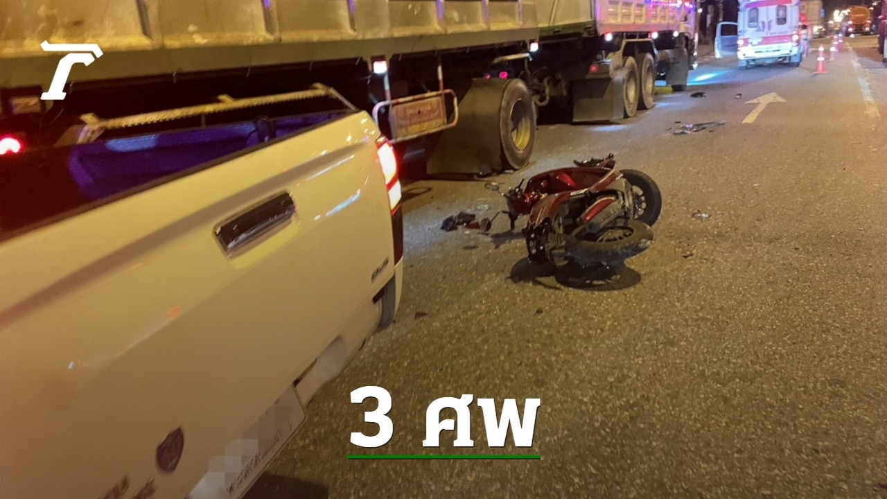 กระบะ 2 คัน ซิ่งตีคู่กันมา จ๊ะเอ๋ จยย.เบี่ยงขวา หักหลบเสยท้ายกันเอง ก่อนหมุนเคว้งไปชน จยย. พุ่งอัดรถพ่วง สลดตาย 3 บาดเจ็บ 1