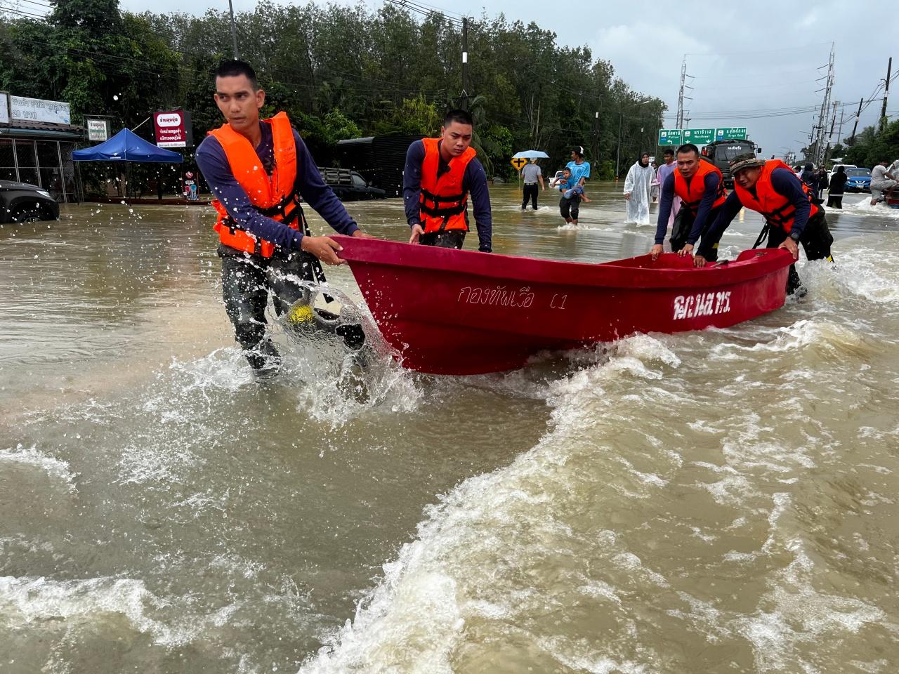 ขณะที่ในพื้นที่ ตำบลลำภู อำเภอเมือง จังหวัดนราธิวาส ยังคงมีมวลน้ำไหลเข้าท่วมสูงขึ้นต่อเนื่อง โดยตั้งแต่ช่วงเช้า ประชาชนต่างช่วยเหลือขนย้ายข้าวของกันเอง โดยน้ำเริ่มขึ้นตั้งแต่ 09.00 น. ของวันนี้ และเพิ่มอย่างรวดเร็ว เจ้าหน้าที่ทหารเรือจากหน่วยเฉพาะกิจนาวิกโยธิน ได้เดินทางมาพร้อมเรือท้องแบนเพื่อช่วยเหลือประชาชน แต่ดำเนินการด้วยความยากลำบาก เนื่องจากกระแสน้ำแรงและเชี่ยว ไม่สามารถนำเรือท้องแบนเข้าช่วยเหลือขนย้ายผู้สูงอายุและเด็กได้