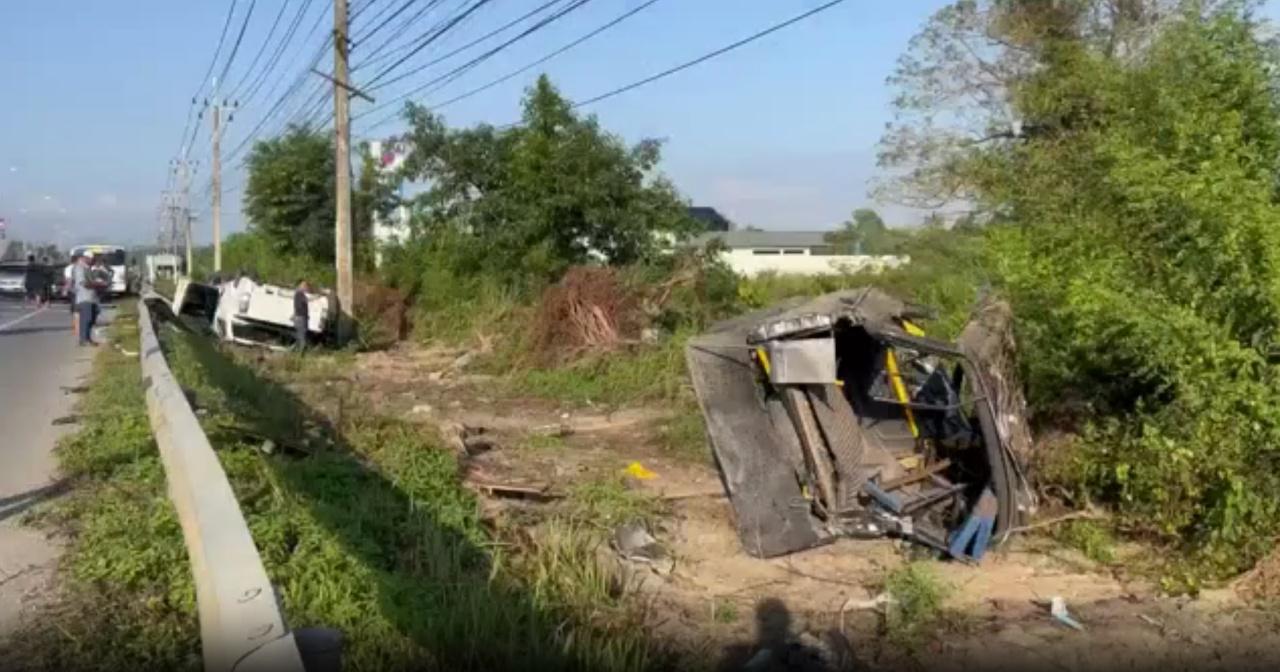 หวิดสลด รถกระบะซิ่งชนท้ายรถสองแถว ผู้โดยสารส่วนใหญ่เป็นนักเรียน ก่อนไปฟาดรถ จยย.อีกคัน ส่งผลให้มีผู้ได้รับบาดเจ็บเกือบ 20 คน อาการสาหัส 1 ราย