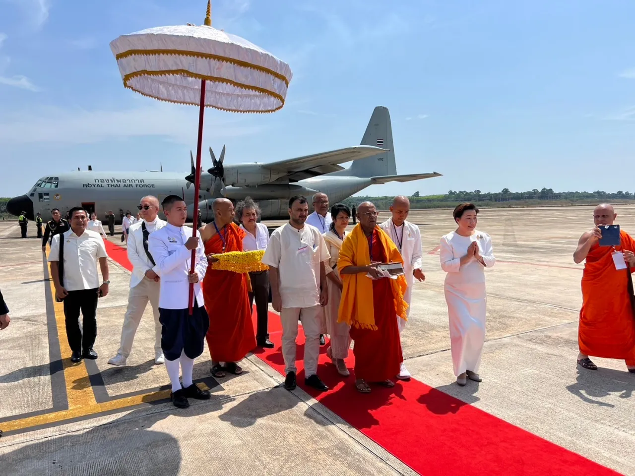 เวลา 10.45 น. วันที่ 14 มี.ค.67 ที่ท่าอากาศยานนานาชาติกระบี่ เครื่องบิน ซี 130 ของกองทัพอากาศ ขบวนอัญเชิญพระบรมสารีริกธาตุและพระอรหันตธาตุพระสารีบุตรและพระโมคคัลลานะ พระอัครสาวก เดินทางจากท่าอากาศยานทหาร กองบิน 21 จ.อุบลราชธานี ถึงจ.กระบี่ ก่อนอัญเชิญไปประดิษฐานเป็นการชั่วคราว ณ วัดมหาธาตุวชิรมงคล ต.นาเหนือ อ.อ่าวลึก เพื่อร่วมเฉลิมพระเกียรติพระบาทสมเด็จพระเจ้าอยู่หัว เนื่องในโอกาสมหามงคลเฉลิมพระชนมพรรษา 6 รอบ โดยมี นางปอโลมี ตริปาฐี อุปทูตสาธารณรัฐอินเดียประจำประเทศไทย นายเสริมศักดิ์ พงษ์พานิช รมว.วัฒนธรรม นางยุพา ทวีวัฒนะกิจบวร ปลัดกระทรวงวัฒนธรรม นายสมชาย หาญภักดีปฏิมา ผวจ.กระบี่ รวมทั้งข้าราชการ พ่อค้า ประชาชนของ จ.กระบี่ รอต้อนรับ