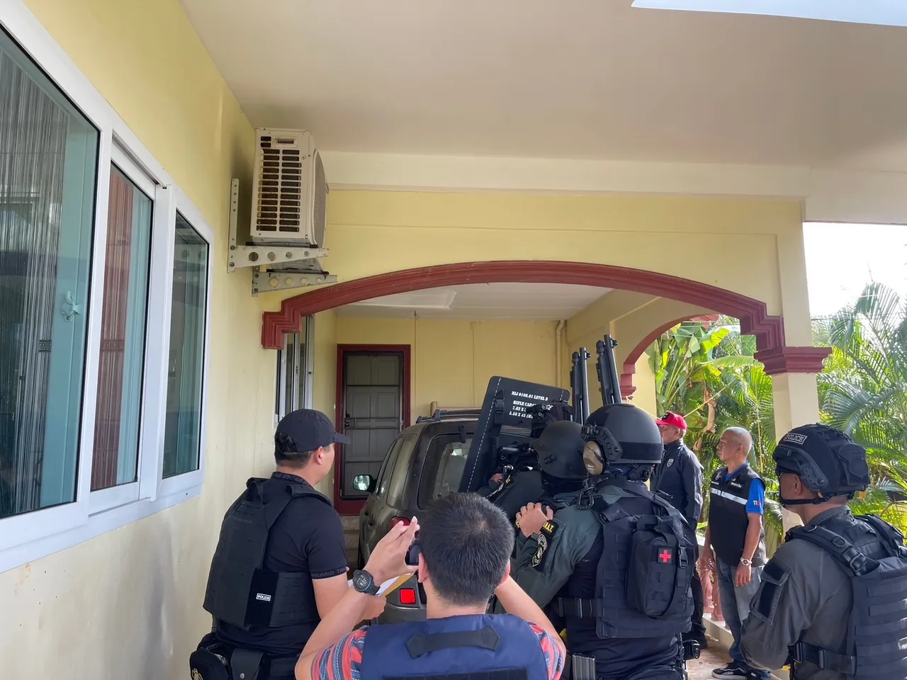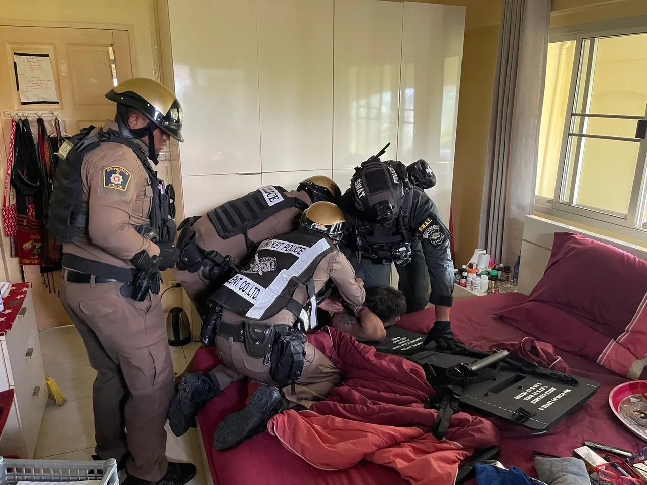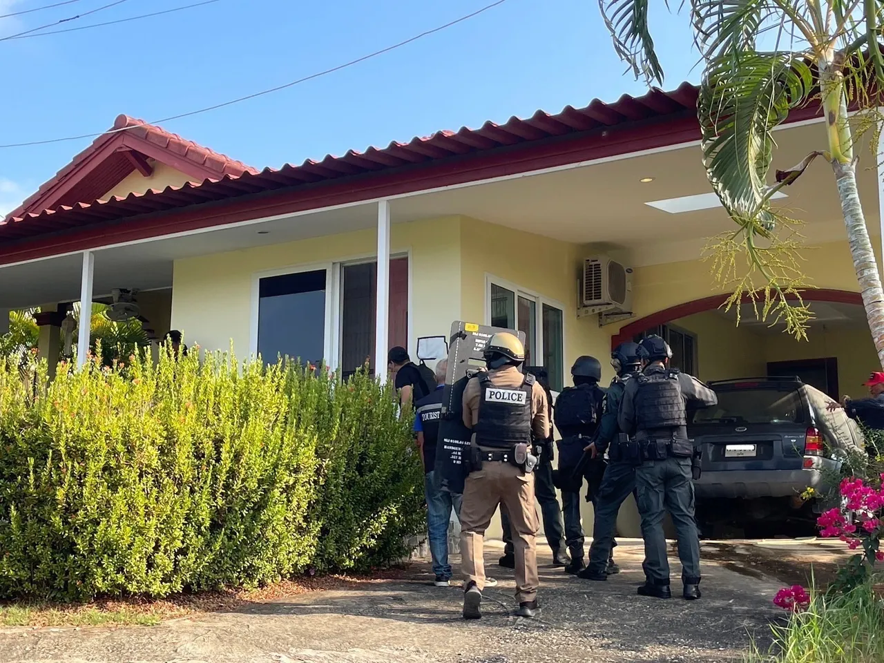 โดยเจ้าหน้าที่ได้แสดงหมายค้นพร้อมกับเข้าเจรจาพูดคุยกันชายชาวเยอรมันดังกล่าว แต่ไม่เป็นผล โดยยังคงมีอาการคลุ้มคลั่ง จึงนำกำลังบุกเข้าตรวจสอบภายในบ้าน พบชายชาวเยอรมันในมือถือขวานพร้อมตะโกนเสียงดังจะขอต่อสู้ ทำให้เจ้าหน้าที่ต้องใช้ยุทธวิธีเข้าควบคุมตัว เพื่อนำตัวไปสอบสวนและตรวจร่างกายก่อนส่งพนักงานสอบสวนดำเนินคดีตามกฎหมายต่อไป