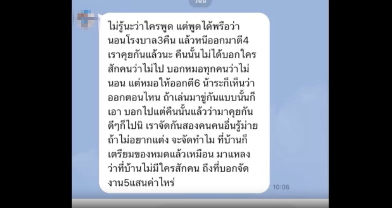 ก่อนที่เวลาประมาณ 3 ทุ่มกว่าของวันนั้น มีญาติฝ่ายเจ้าสาวมาที่โรงพยาบาลเกือบ 10 คน มาด่าตนและแม่ พูดจาข่มขู่ว่าจะยิงทิ้งทั้งบ้านหากไม่ไปงานแต่ง ทั้งที่ตนก็บอกไปแล้วว่าจะไป แต่ทำไมญาติเขาต้องมาด่าตนและแม่ขนาดนี้ ซึ่งตนก็บอกว่าให้เขามาขอโทษ แต่ช่วงตี 5 ของวันที่ 11 มี.ค. เขาก็ยังจะโทรมาขู่อีก ตนก็พยายามติดต่อเจ้าสาว แต่เขาไม่รับสาย ตนจึงตัดสินใจว่าจะไม่ไปงานแต่ง โดยออกจากโรงพยาบาลมาตอน 6 โมงเช้า และกลับมาบ้าน ไม่ได้หนีไปตามที่เป็นข่าว ญาติเจ้าสาวก็มาตามตนเองที่บ้าน เขาก็เห็นว่าตนอยู่ และยังขู่ตนด้วย