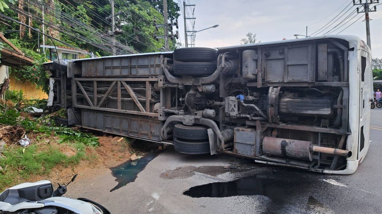 เมื่อเวลา 17.20 น. วันที่ 22 มี.ค. 2568 เจ้าหน้าที่ตำรวจ สภ.กมลา จ.ภูเก็ต ได้รับแจ้งจากชาวบ้านว่าเกิดอุบัติเหตุรถบัสรับส่งนักท่องเที่ยวพลิกคว่ำบริเวณควนยักษ์ ถ.กมลา-ป่าตอง ต.กมลา อ.กะทู้ มีผู้บาดเจ็บเป็นจำนวนมาก จึงประสาน รพ.ป่าตองและทีมกู้ชีพ อบต.กมลารุดไปตรวจสอบและให้การช่วยเหลือผู้บาดเจ็บ โดยที่เกิดเหตุเป็นทางลงเขาที่มีความลาดชันบนถนนขนาด 2 เลน พบรถบัสสีขาวตะแคงข้างอยู่ริมถนนสายดังกล่าว