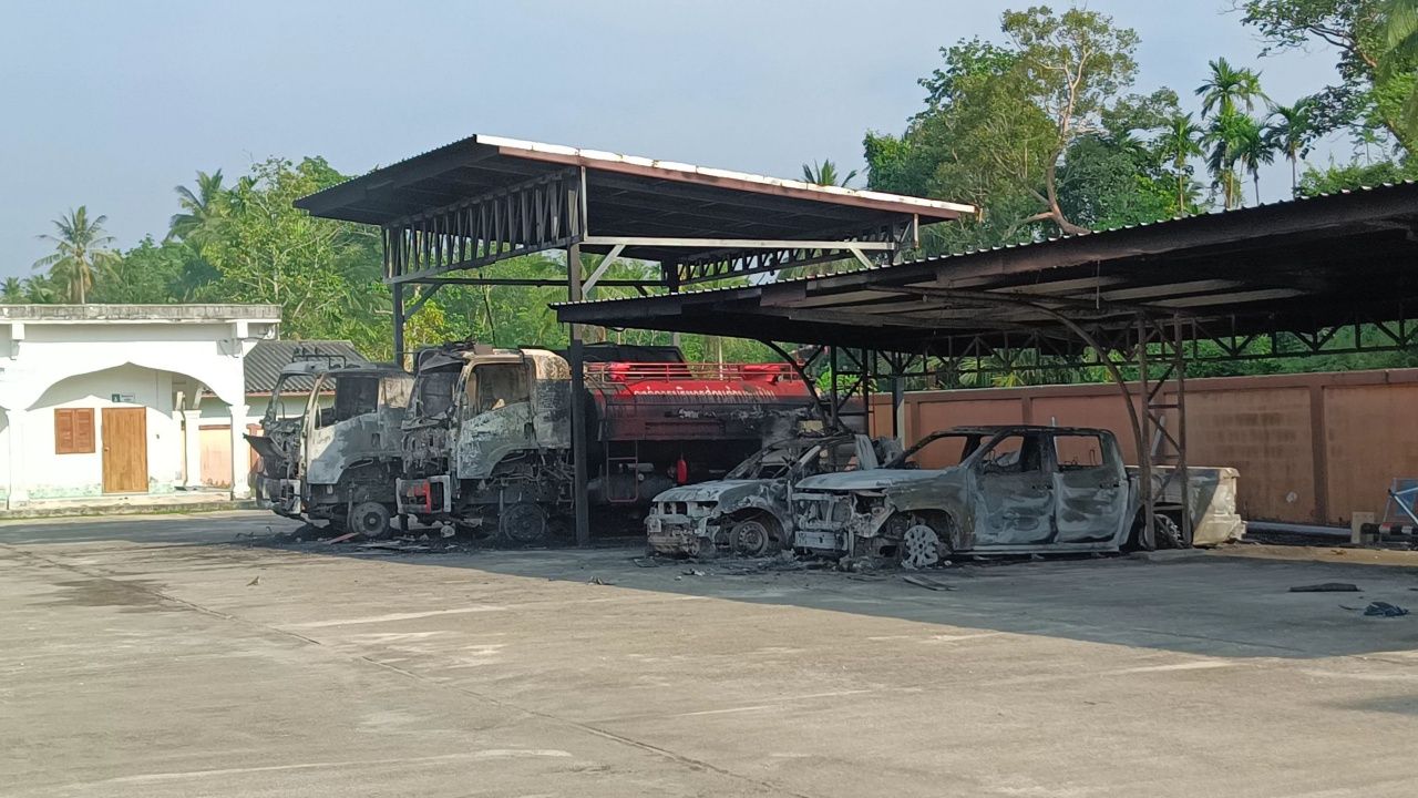 ระหว่างนั้นได้มีเจ้าหน้าที่ อบต. อีก 1 คน กำลังเดินเข้ามา คนร้ายจึงใช้อาวุธปืนยิงขึ้นฟ้า ทำให้เจ้าหน้าที่วิ่งหนี จากนั้นคนร้ายได้แบ่งกำลังเป็น 2 ชุด โดยชุดแรกได้เข้าไปวางเพลิงรถยนต์ที่จอดไว้ในโรงรถ ส่วนชุดที่สองได้บุกเข้าไปในอาคารราดน้ำมันเบนซินเผาภายในห้องทะเบียน จุดเกิดเพลิงไหม้ทั้งสองจุด หลังก่อเหตุคนร้ายได้หลบหนีไปทางด้านหลังอาคารก่อนจะปีนกำแพงหนีเข้าไปในป่า