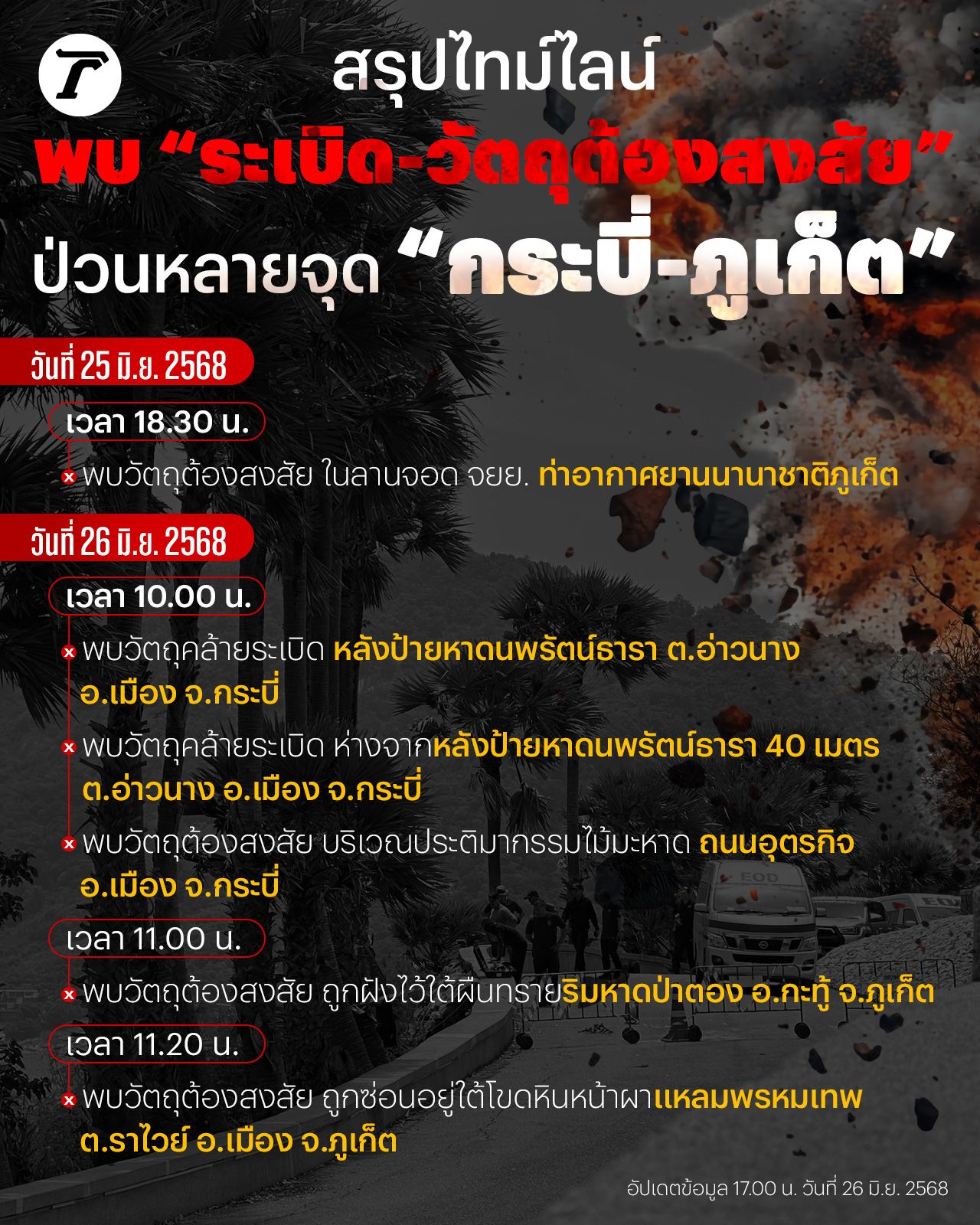 สรุปไทม์ไลน์พบ "ระเบิดภาคใต้-วัตถุต้องสงสัย" ป่วนหลายจุดจังหวัด "ภูเก็ต-กระบี่" โดยเจ้าหน้าที่เก็บกู้ทำลายได้สำเร็จ