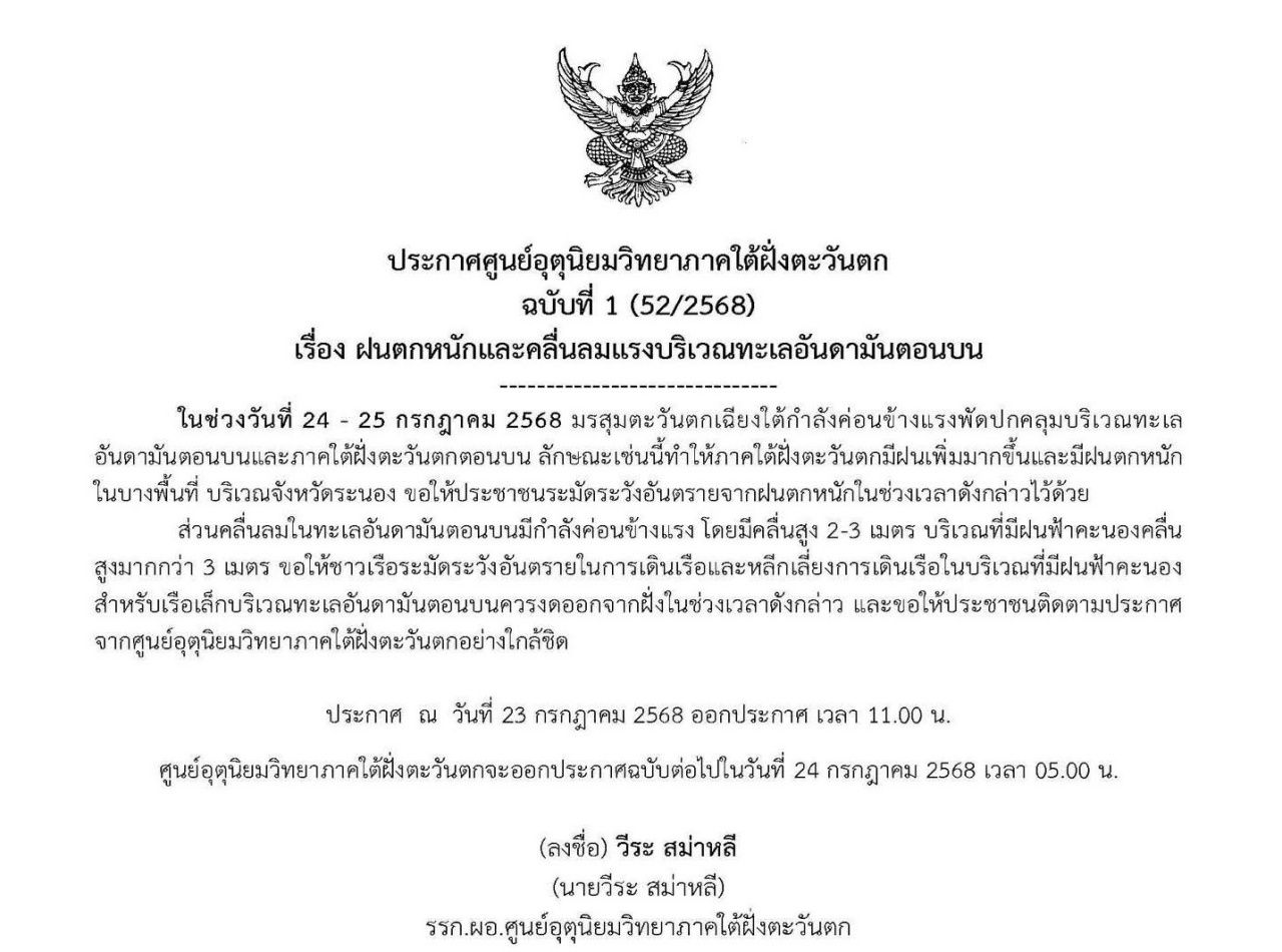 เมื่อวันที่ 23 ก.ค. 2568 ศูนย์อุตุนิยมวิทยาภาคใต้ฝั่งตะวันตก ประกาศฉบับที่ 1 เรื่อง "ฝนตกหนักและคลื่นลมแรงบริเวณทะเลอันดามันตอนบน" โดยระบุว่า ในช่วงวันที่ 24 - 25 กรกฎาคม 2568 มรสุมตะวันตกเฉียงใต้กำลังค่อนข้างแรงพัดปกคลุมบริเวณทะเลอันดามันตอนบนและภาคใต้ฝั่งตะวันตกตอนบน
