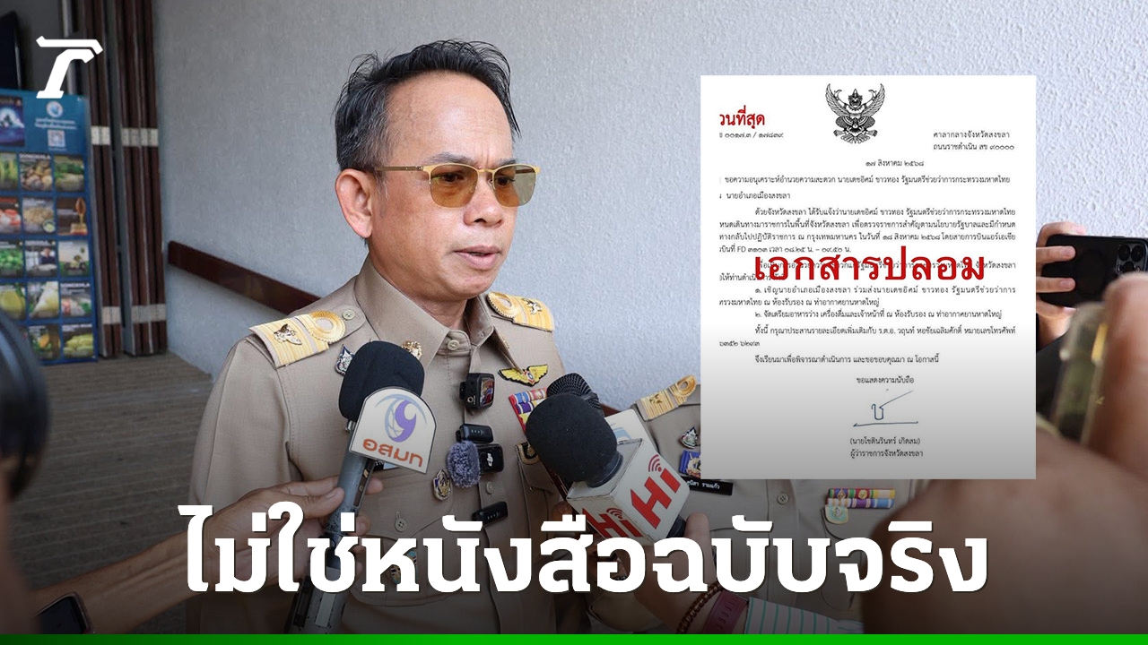 "ผู้ว่าราชการจังหวัดสงขลา" ยืนยันหนังสือคำสั่งให้ "นายอำเภอเมือง" จัดอาหารว่าง-เตรียมเจ้าหน้าที่ ต้อนรับ "รัฐมนตรีช่วยว่าการกระทรวงมหาดไทย" เป็นของปลอม ไม่ใช่หนังสือฉบับจริง