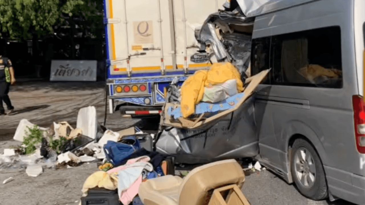 เปิดภาพวงจรปิด นาที "รถตู้นักเรียน" เสียหลักพุ่งชนท้าย 10 ล้อ ขณะจอดริมถนนหน้าปั๊มน้ำมัน ส่วนสาเหตุคาดคนขับรถตู้หลับใน