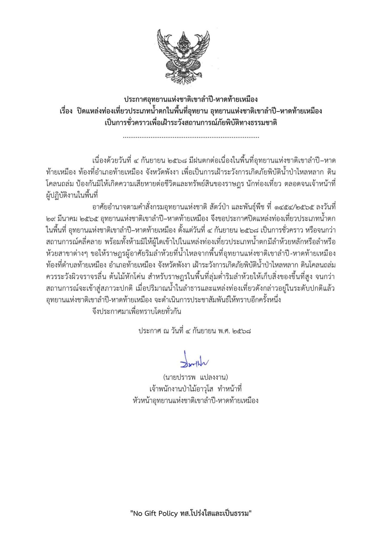 อุทยานแห่งชาติเขาลำปี-หาดท้ายเหมือง จึงประกาศเรื่อง ปิดแหล่งท่องเที่ยวประเภทน้ำตกในพื้นที่อุทยาน เพื่อเฝ้าระวังสถานการณ์ภัยพิบัติทางธรรมชาติ ตั้งแต่วันที่ 4 กันยายน 2568 เป็นการชั่วคราว หรือจนกว่าสถานการณ์คลี่คลาย พร้อมทั้งห้ามมิให้ผู้ใดเข้าไปในแหล่งท่องเที่ยวประเภทน้ำตกที่มีลำห้วยหลักหรือลำห้วยสาขาต่างๆ