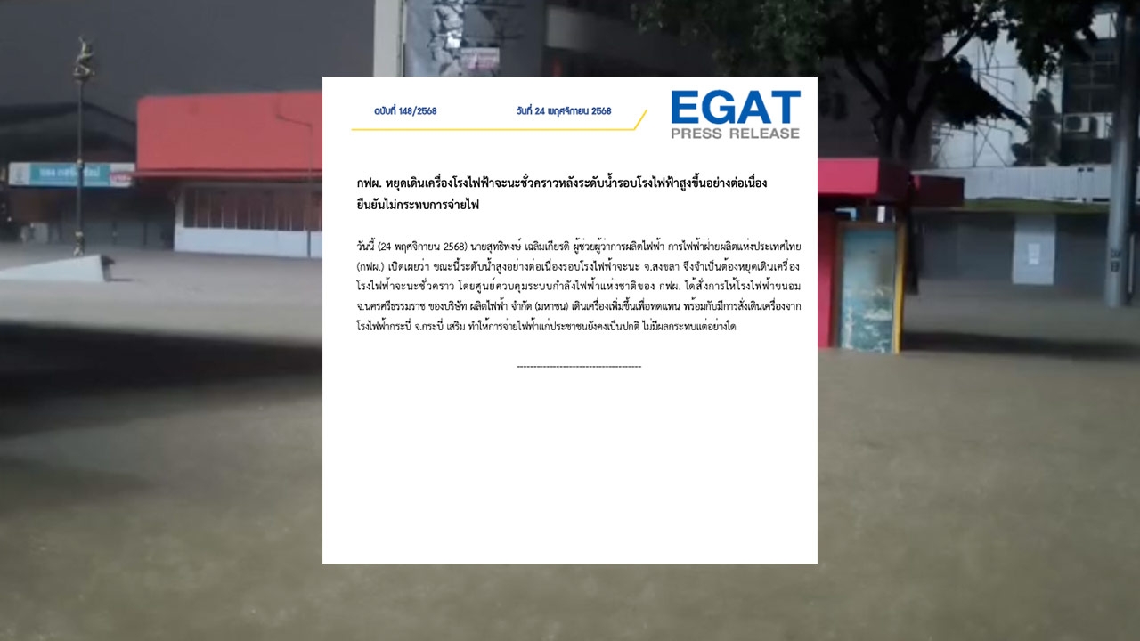กฟผ. หยุดเดินเครื่องโรงไฟฟ้าจะนะชั่วคราวหลังระดับน้ำรอบโรงไฟฟ้าสูงขึ้นอย่างต่อเนื่อง ยืนยันไม่กระทบการจ่ายไฟ