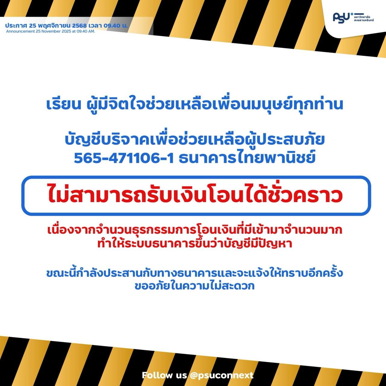 วันที่ 25 พ.ย. 68 ผู้สื่อข่าวรายงานว่า จากสถานการณ์น้ำท่วมหนักในพื้นที่สงขลา ซึ่งต่อมาทาง มหาวิทยาลัยสงขลานครินทร์ ได้เปิดบัญชีบริจาคเพื่อช่วยเหลือผู้ประสบภัย แต่ล่าสุดทางมหาวิทยาลัยฯ แจ้งว่า บัญชีบริจาคเพื่อช่วยเหลือผู้ประสบภัย 565-471106-1 ธนาคารไทยพาณิชย์ ไม่สามารถรับเงินโอนได้ชั่วคราว เนื่องจากจำนวนธุรกรรมการโอนเงินที่มีเข้ามาจำนวนมาก ทำให้ระบบธนาคารขึ้นว่าบัญชีมีปัญหา ขณะนี้กำลังประสานกับทางธนาคารและจะแจ้งให้ทราบอีกครั้ง ขออภัยในความไม่สะดวก