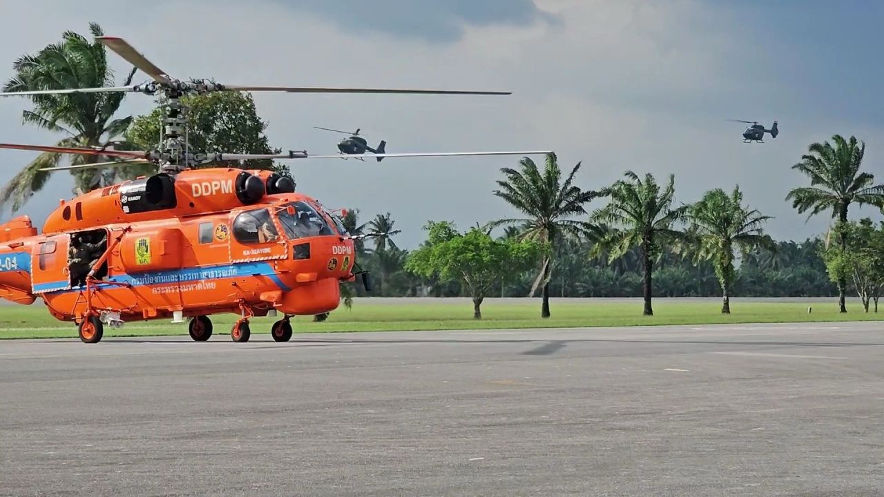 ฝูงบินเฮลิคอปเตอร์ จากหลายหน่วยงาน แวะเติมน้ำมันเชื้อเพลิง ที่สนามบินกองทัพภาคที่ 4 ค่ายวชิราวุธ จ.นครศรีธรรมราช ก่อนบินช่วยน้ำท่วมหาดใหญ่
