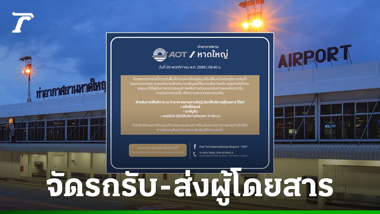 หาดใหญ่กลับมาบิน "สนามบินหาดใหญ่" จัดรถบริการรับส่งผู้โดยสาร หลังระดับน้ำหลายจุดลดลง รถยนต์ขนาดเล็กสามารถสัญจรได้ในบางเส้นทาง พร้อมมีรถสนับสนุนจาก มทบ. 42 และ แขวงทางหลวงสงขลา 1