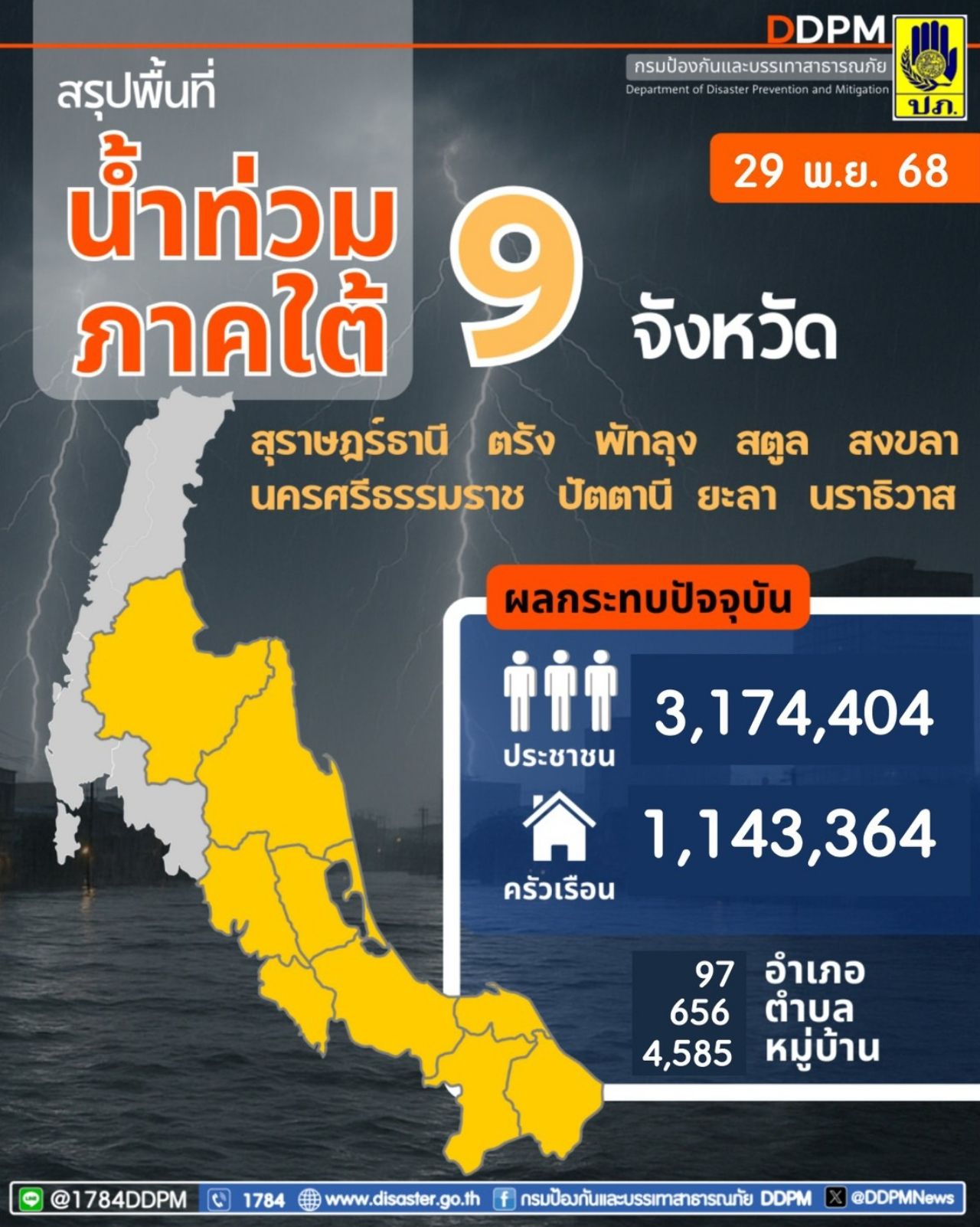 นายธีรพัฒน์ คัชมาตย์ อธิบดีกรมป้องกันและบรรเทาสาธารณภัย เปิดเผยว่า จากการติดตามสถานการณ์น้ำท่วมในพื้นที่ภาคใต้ ปัจจุบัน (ข้อมูล ณ วันที่ 29 พ.ย. 68 เวลา 06.00 น.) ยังมีสถานการณ์อุทกภัยในพื้นที่ภาคใต้ ยังคงมีสถานการณ์ในพื้นที่ 9 จังหวัด ได้แก่ สุราษฎร์ธานี นครศรีธรรมราช ตรัง พัทลุง สตูล สงขลา ปัตตานี ยะลา และนราธิวาส กินพื้นที่ 97 อำเภอ 656 ตำบล 4,585 หมู่บ้าน ประชาชนได้รับผลกระทบ 1,143,364 ครัวเรือน 3,174,404 คน ดังนี้