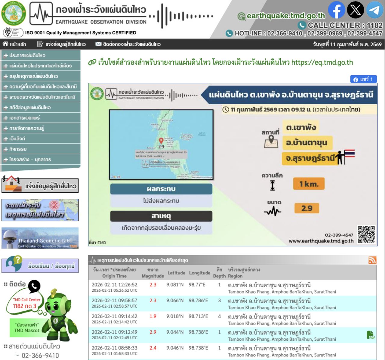 วันที่ 11 ก.พ. 69 เว็บไซต์ กองเฝ้าระวังแผ่นดินไหว รายงานเหตุการณ์แผ่นดินไหวในประเทศ ศูนย์กลางอยู่ที่ ต.เขาพัง อ.บ้านตาขุน จ.สุราษฎร์ธานี ซึ่งเกิดจากกลุ่มรอยเลื่อนคลองมะรุ่ย