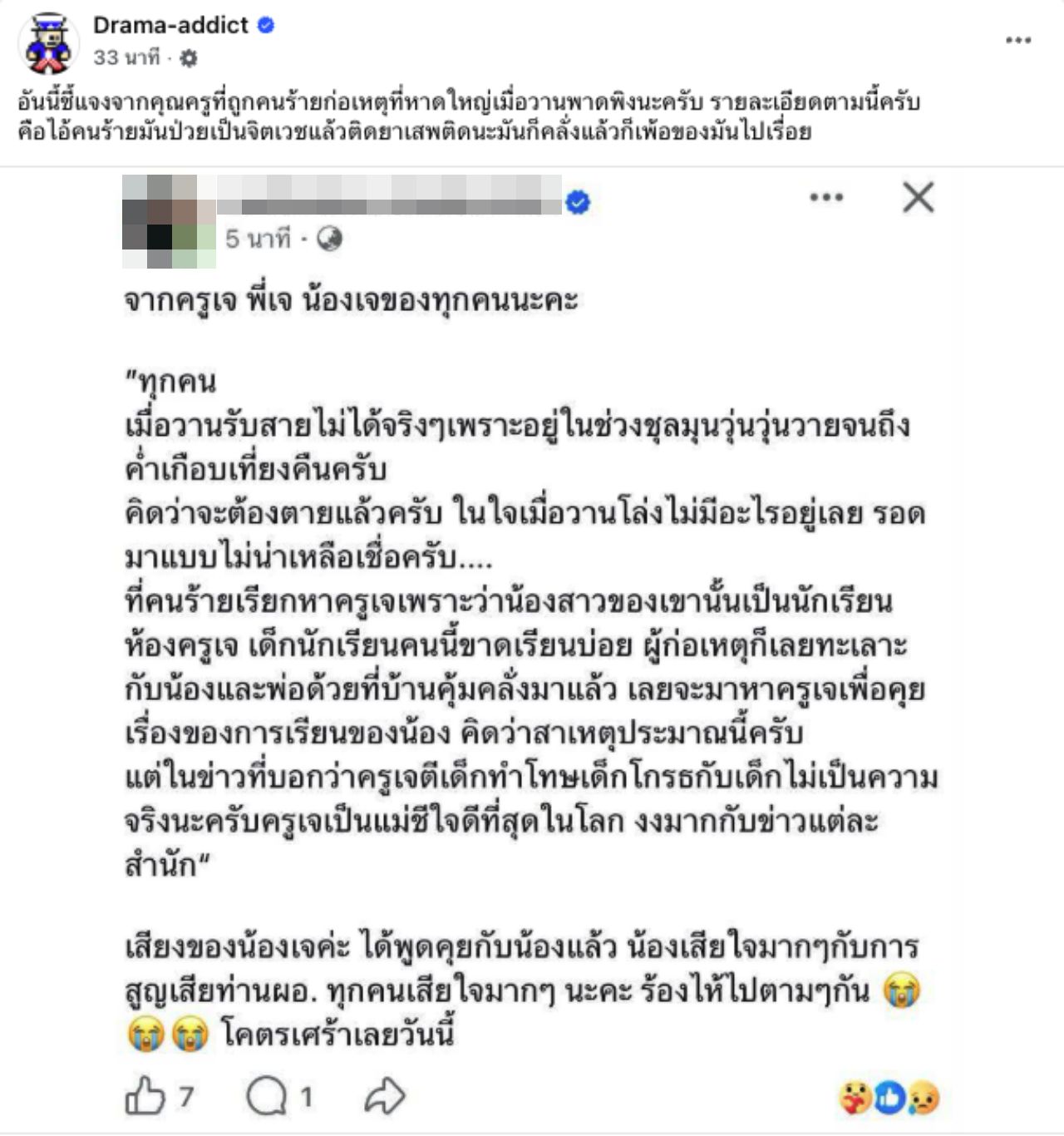 แต่ในข่าวที่บอกว่าครูเจตีเด็กทำโทษเด็ก โกรธเด็กไม่เป็นความจริงนะครับ ครูเจเป็นแม่ชีใจดีที่สุดในโลก งงมากกับข่าวแต่ละสำนัก” เสียงของน้องเจค่ะ ได้พูดคุยกับน้องแล้ว น้องเสียใจมากๆกับการสูญเสียท่านผอ. ทุกคนเสียใจมากๆ นะคะ ร้องไห้ไปตามๆกัน โคตรเศร้าเลยวันนี้.
