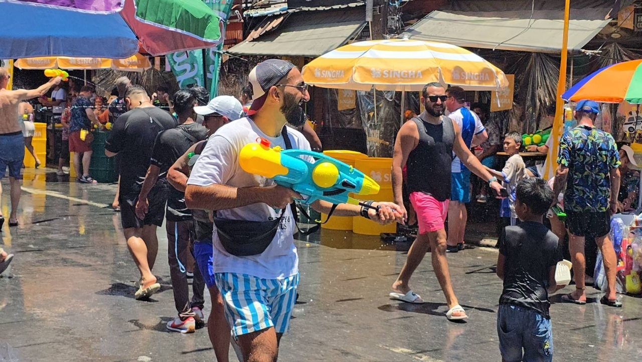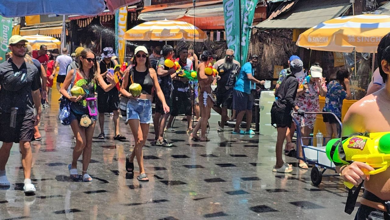 นักท่องเที่ยวต่างนำปืนฉีดน้ำออกมาเล่นสาดน้ำใส่กันอย่างสนุกสนานตลอดแนวถนน ขณะที่พ่อค้าแม่ค้าเริ่มนำอุปกรณ์เล่นน้ำและน้ำดื่มออกมาจำหน่ายสร้างสีสันและความคึกคักให้กับพื้นที่