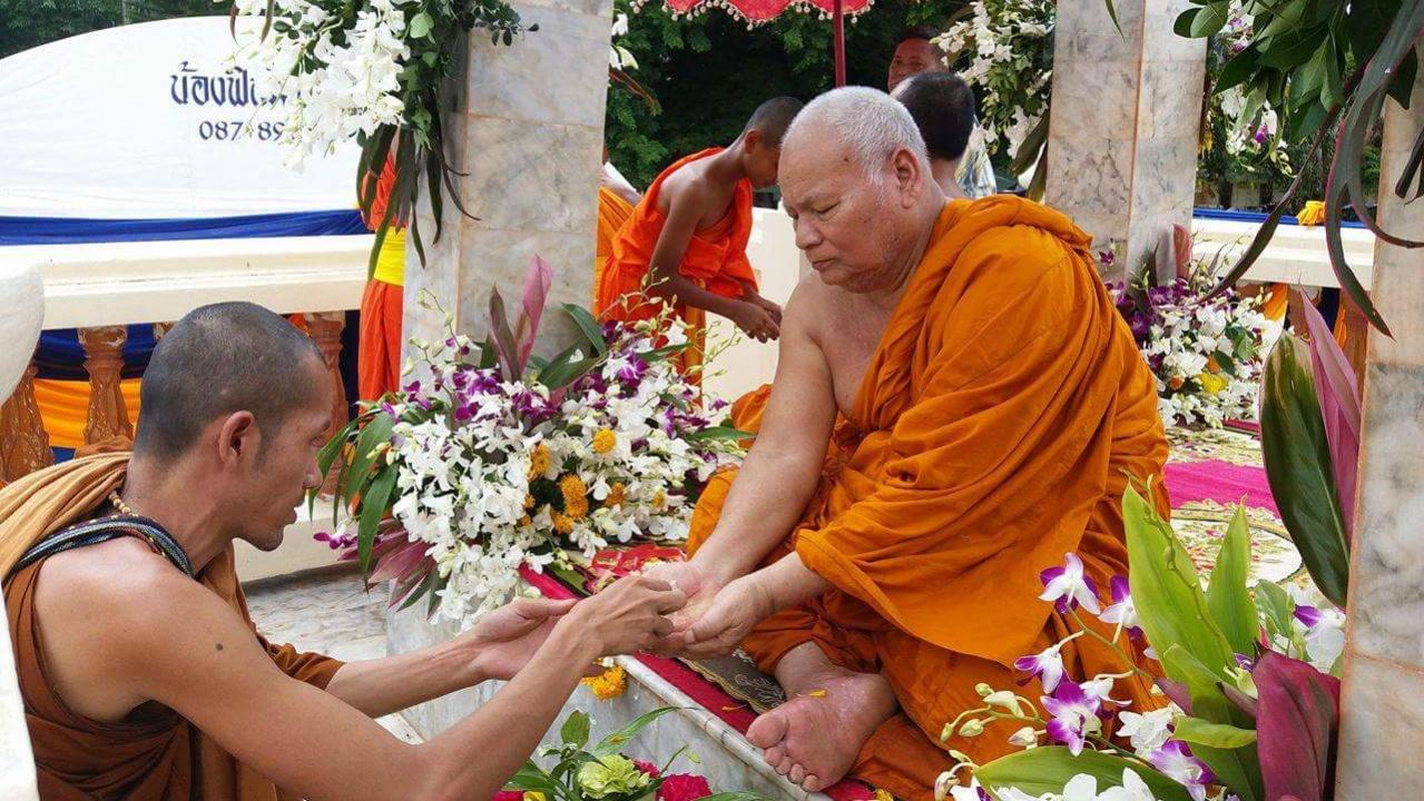 จากนั้น ได้นิมนต์พระครูปิยสมาธิวัตรขึ้นไปนั่งบนเก้าอี้ที่จัดทำขึ้น ก่อนจะแบกไม้ไผ่ที่ทำเป็นที่นั่งสำหรับพระขึ้นบ่าแห่เวียนรอบโบสถ์ 3 รอบ ระหว่างที่ขบวนเริ่มแห่เวียนรอบโบสถ์ ประชาชนที่มาร่วมงานก็ได้ร้องเพลงกลองยาวทำนองภาษาปักษ์ใต้ รำหน้าขบวนแห่พระอย่างสนุกสนาน เมื่อขบวนแห่เวียนครบ 3 รอบจึงนิมนต์พระครูปิยสมาธิวัตรลงจากที่นั่งเข้าไปยังสถานที่ที่จัดเตรียมไว้สำหรับพิธีสรงน้ำให้กับพระครูปิยสมาธิวัตร ที่มีอายุครบ 71 ปี และบวชมาแล้ว 47 พรรษา ถือเป็นพระผู้ใหญ่ที่ปฏิบัติดีปฏิบัติชอบอยู่ในศีลในธรรมมาโดยตลอดเวลาที่อยู่ที่วัดแห่งนี้ และถือเป็นธรรมเนียมปฏิบัติดีงามที่ยึดถือกันมายาวนานของชาวบ้านที่นี่.