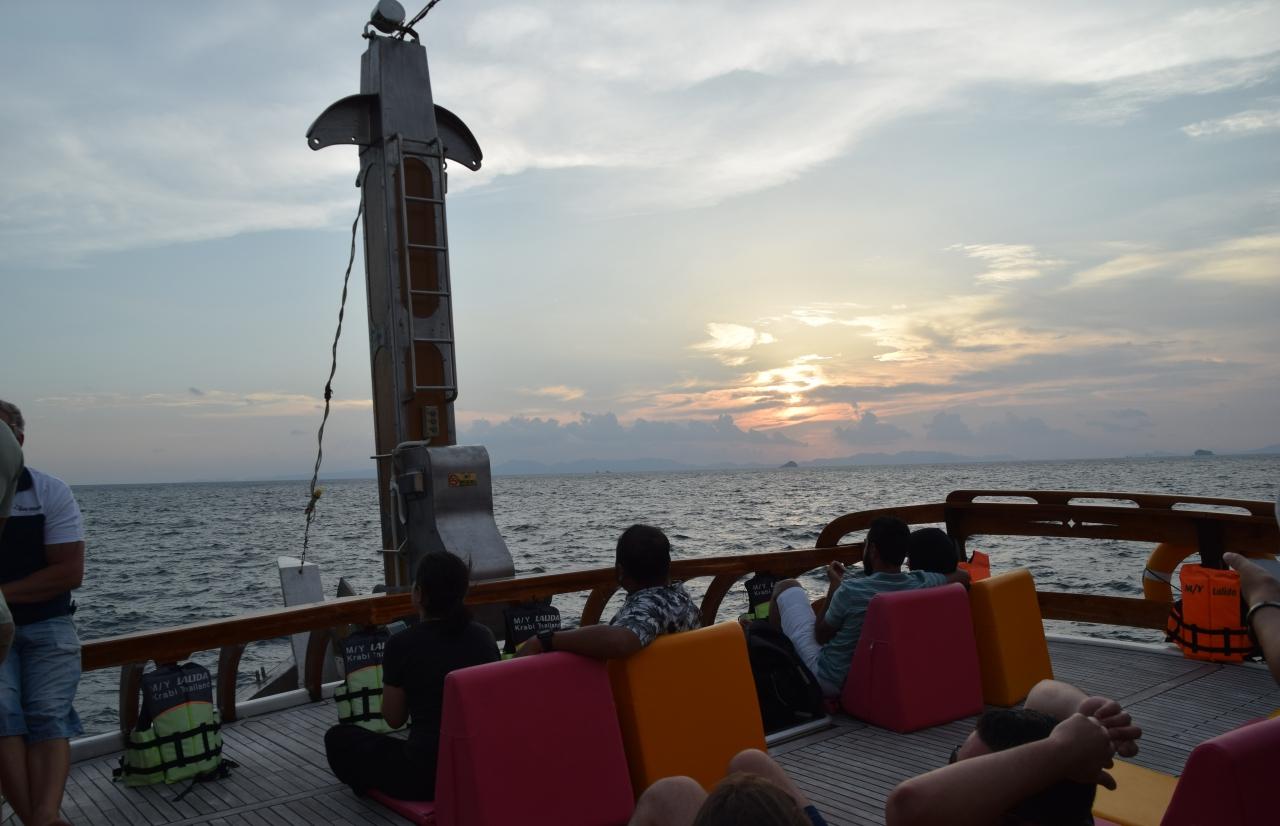 จากนั้นล่องเรือไปยังหมู่เกาะปอดะ ชมพระอาทิตย์ตกและจอดทอดสมอรอที่เกาะไก่ ทะเลแหวก เพื่อชมค้างคาวแม่ไก่ขนาดใหญ่บินออกจากยอดของภูเขา เพื่อไปหากินบนแผ่นดิน ซึ่งค้างคาวดังกล่าวเหล่านี้ จะทยอยบินออกมาเป็นจำนวนนับแสนตัวใช้เวลากว่าครึ่งชม.จึงจะหมด จากนั้นทานอาหารค่ำแบบซีฟู้ดบนเรือก่อนเดินทางกลับ ซึ่งกำลังได้รับความนิยมอย่างมาก.