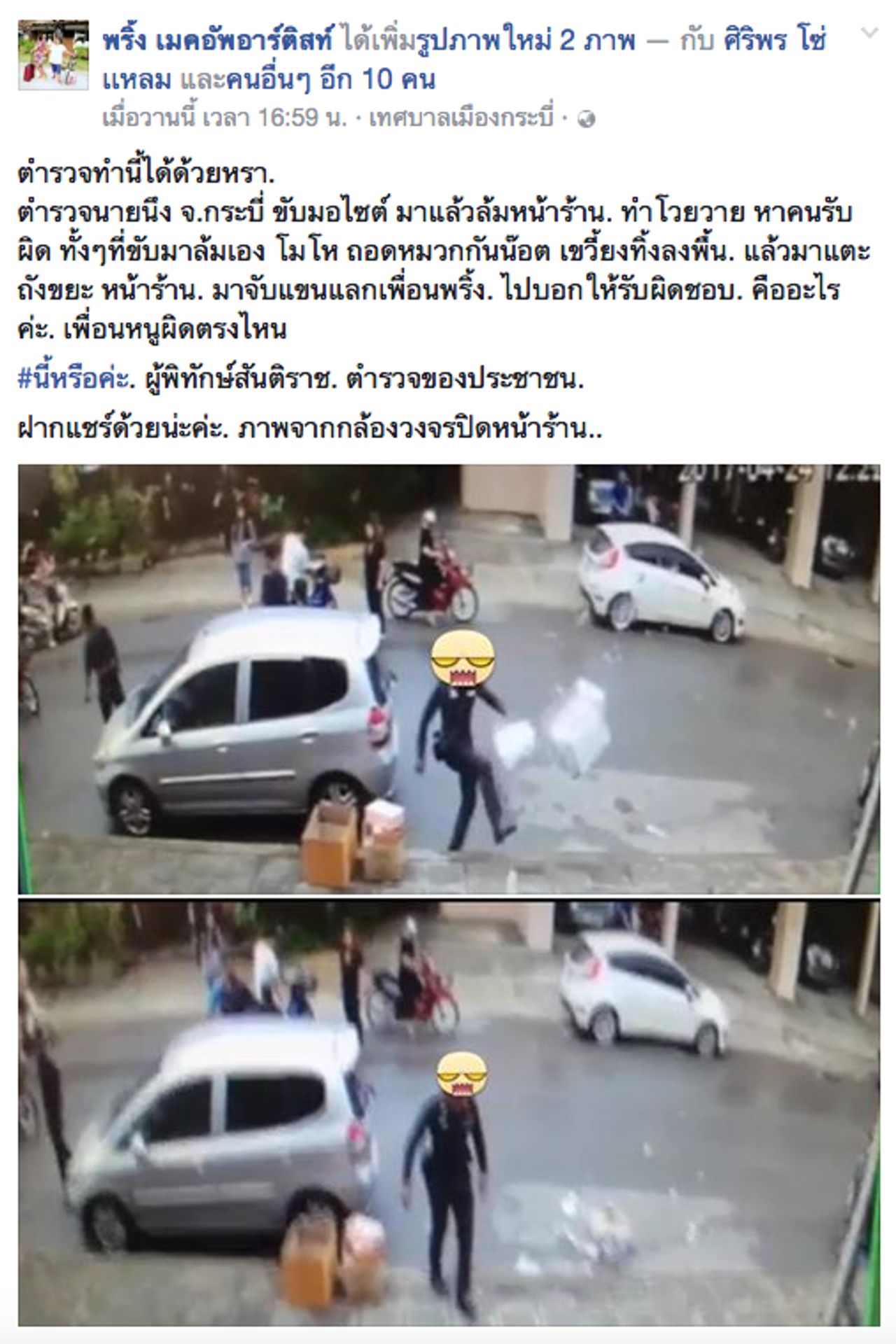 โดยผู้ใช้เฟซบุ๊กชื่อว่า พริ้ง เมคอัพอาร์ติสท์ ได้โพสต์ข้อความเล่าเหตุการณ์ไว้ว่า "ตำรวจทำนี้ได้ด้วยเหรอ ตำรวจนายหนึ่ง จ.กระบี่ ขับมอเตอร์ไซต์มา แล้วล้มหน้าร้าน ทำโวยวาย หาคนรับผิด ทั้งๆ ที่ขับมาล้มเอง โมโห ถอดหมวกกันน็อก เขวี้ยงทิ้งลงพื้น แล้วมาเตะถังขยะหน้าร้าน มาจับแขนแลกเพื่อนพริ้ง ไปบอกให้รับผิดชอบ คืออะไรคะ เพื่อนหนูผิดตรงไหน"