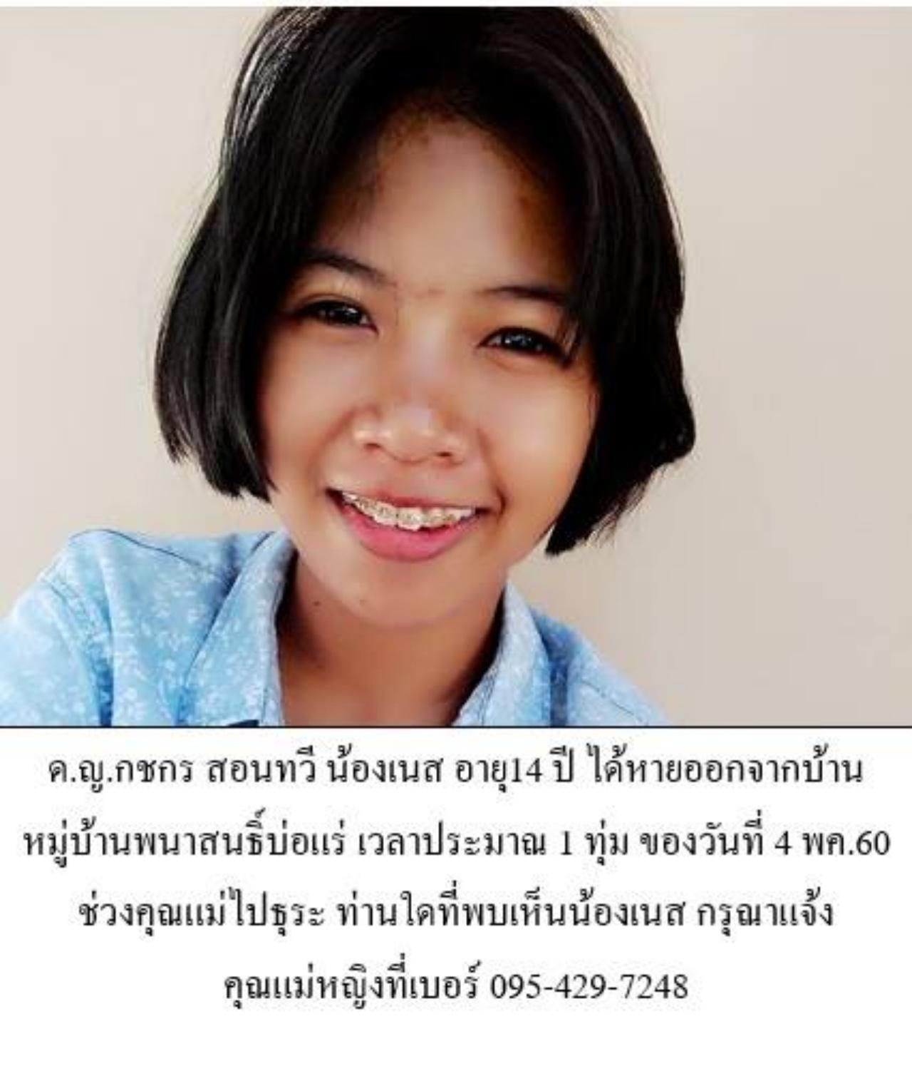 ช่วงสายวันที่ 5 พ.ค.โซเชียลมีเดียต่างๆ ในพื้นที่ จ.ภูเก็ต ได้มีการแชร์ภาพบุคคลหาย เพื่อขอให้ช่วยติดตามตัว เป็นภาพเด็กสาวหน้าตาดีพร้อมระบุข้อความว่า “ด.ญ.กชกร สอนทวี หรือ น้องเนส อายุ 14 ปี ได้หายออกจากบ้านภายในหมู่บ้านพนาสนธิ์บ้านบ่อแร่ ต.วิชิต อ.เมือง จ.ภูเก็ต เมื่อเวลาประมาณ 1 ทุ่ม วันที่ 4 พ.ค.ที่ผ่านมา ช่วงที่คุณแม่ไปธุระ ท่านใดพบเห็นน้องเนส กรุณาแจ้งแม่หญิงที่เบอร์ 095-4297248”