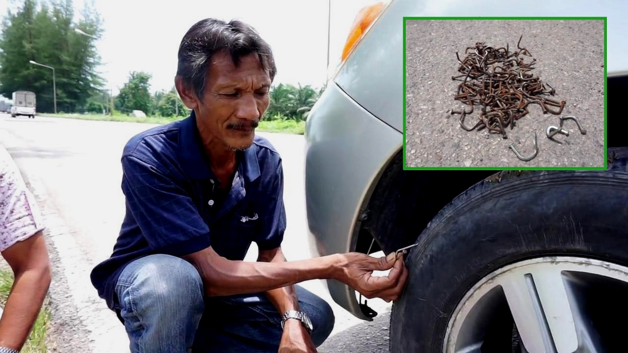 เมื่อเวลา 15.00 น. วันที่ 6 พ.ค. 60 นายธงชัย เอี่ยมหิรัญ เจ้าหน้าที่หมวดการทางหลวงหลังสวน จ.ชุมพร ได้รับแจ้งจาก นายสุทิน กาญจนนิยม อายุ 53 ปี และนางสุดใจ กาญจนนิยม อายุ 44 ปี สามีภรรยาชาวสวน ว่า รถกระบะถูกตะปูเรือใบเจาะเข้าที่ล้อหน้าด้านซ้าย และพบตะปูเรือใบจำนวนมากถูกโรยอยู่ริมถนนสายเอเชีย 41 ช่องทางขาขึ้น กม.ที่ 68-69 หมู่ที่ 3 ต.ท่ามะพลา อ.หลังสวน จ.ชุมพร คาดว่าเป็นพวกมิจฉาชีพนำมาโรยทิ้งไว้เพื่อประสงค์ต่อทรัพย์ หรือมีเจตนาร้ายต่อผู้ที่สัญจรบนถนนสายดังกล่าว