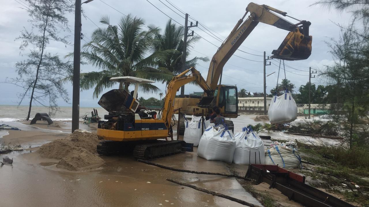 นายภัคพงศ์ ทวิพัฒน์ ผวจ.พังงา กล่าวว่า ขณะนี้ทางจังหวัดได้ส่งรถแบ็กโฮพร้อมรถบรรทุกลงเรือข้ามฟากเข้าไปช่วยเหลือ ขุดทำแนวกันคลื่น และตักทรายบรรจุใส่กระสอบ นำไปวางเป็นแนวกันคลื่นบริเวณชายหาดที่มีบ้านเรือนประชาชน เพื่อกันไม่ให้คลื่นกัดเซาะน้ำทะเลเข้าบ้านเรือนพังเสียหายมากเพิ่มขึ้น เป็นการแก้ปัญหาเบื้องต้นได้เฉพาะระยะสั้นๆ แต่เมื่อมีน้ำทะเลหนุนสูง บิ๊กแบ็กไม่สามารถป้องกันได้ จะถูกคลื่นซัดพังเสียหายหมด