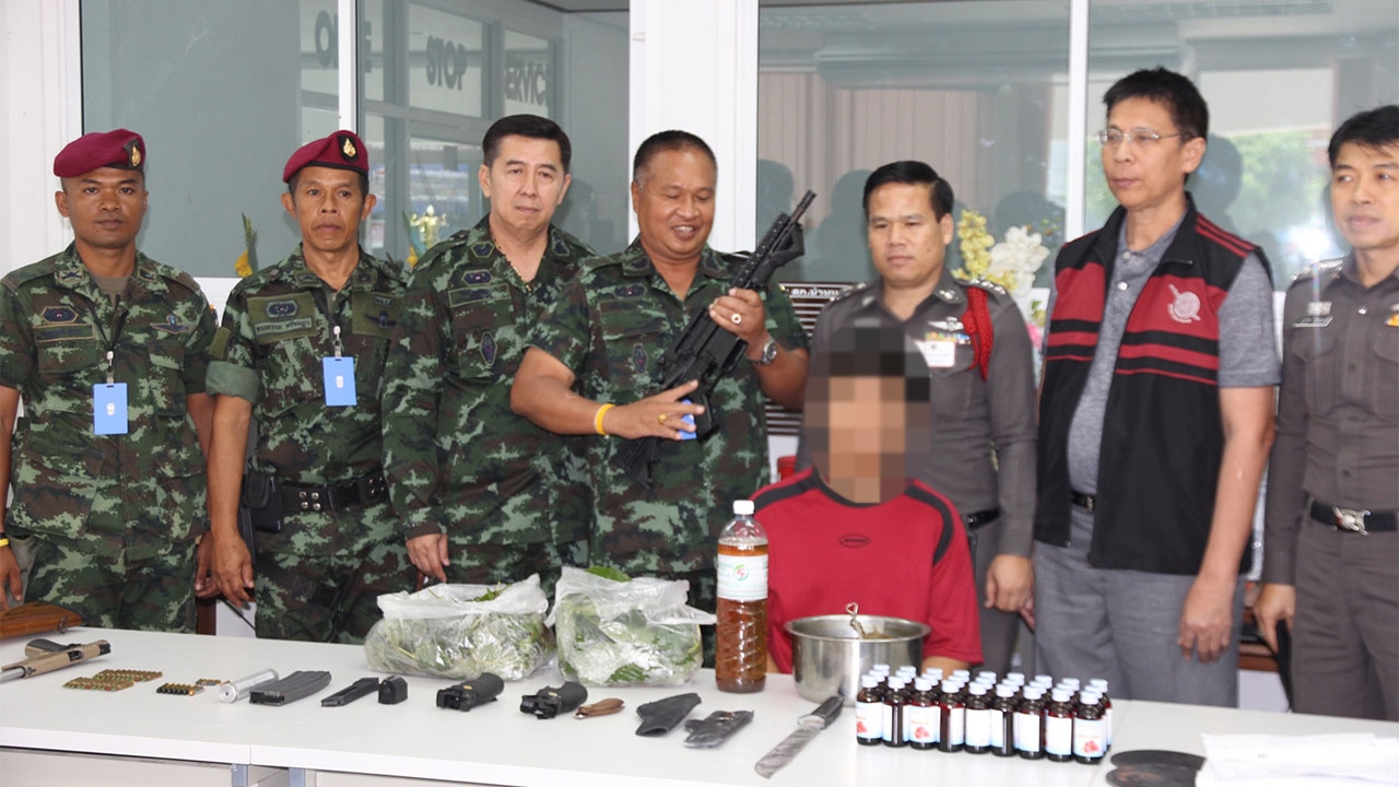 เมื่อเวลา 13.30 น. วันที่ 3 มิ.ย.60 พ.อ.เกรียงไกร ศรีรักษ์ รองผบ.พล.ร.5 พ.อ.ทรงพล สุมนาวดี รอง ผอ.รมน.สุราษฎร์ธานี พ.ต.อ.วิชอบ เกิดเกลี้ยง รอง ผบก.ภ.จว.สุราษฎร์ธานี พร้อมเจ้าหน้าที่ชุดจับกุม ร่วมสอบปากคำ นายนเรนทรฤทธิ์ ทองสีทอง อายุ 25 ปี อยู่บ้านเลขที่ 185/5 หมู่ 6 ต.ทุ่งเตาใหม่ อ.บ้านนาสาร จ.สุราษฎร์ธานี หลังจับกุม สามารถตรวจค้นได้ที่บ้านดังกล่าว พร้อมของกลาง 25 รายการ อาทิ อาวุธปืน เอ็ม 16 จำนวน 1 กระบอก .22 สั้นและยาว อย่างละ 1 กระบอก เครื่องกระสุนหลายรายการ พืชกระท่อม ยาแก้ไอ และกล่องส่งสินค้าจำนวนหนึ่ง