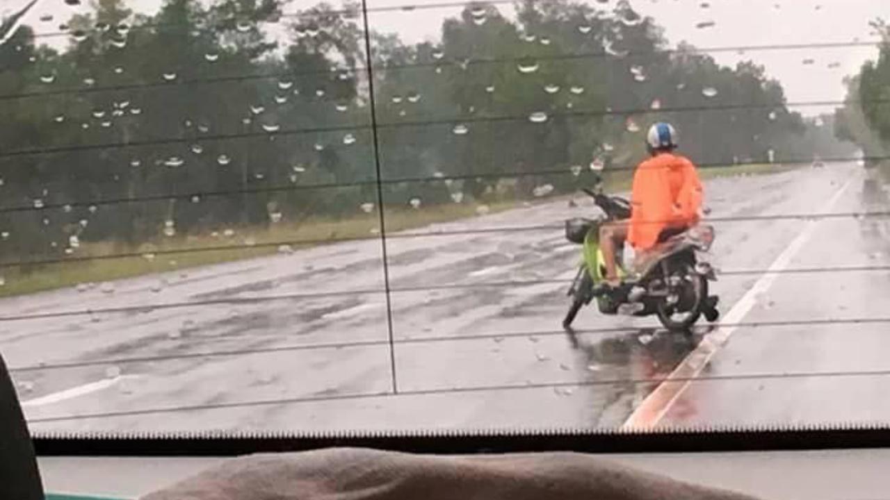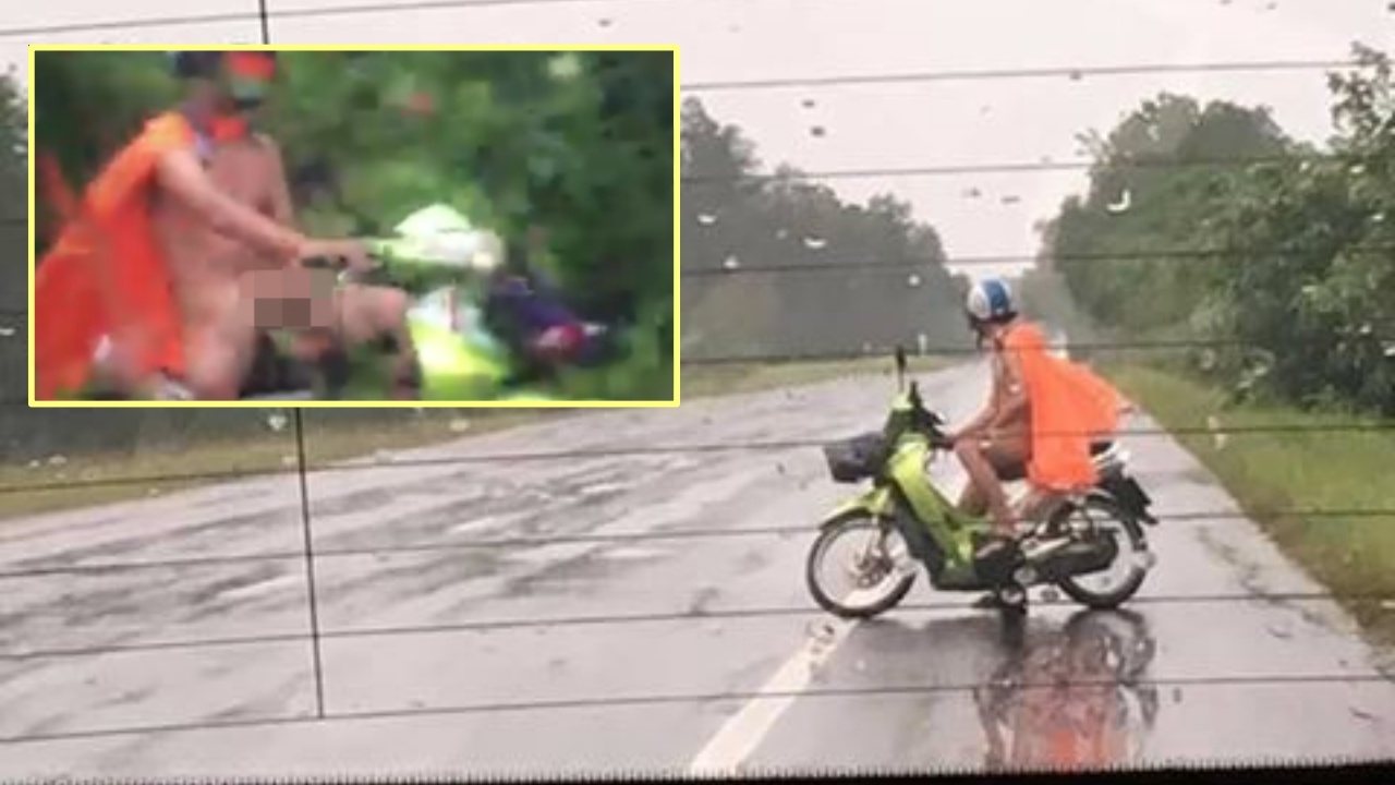 เมืองคนดี แต่คนบ้าก็มีไม่น้อย หนุ่มหุ่นสูงชะลูด ขี่รถ จยย.ฝ่าสายฝน สภาพไม่สวมเสื้อกางเกง โชว์ช่วยตัวเองให้คนขับรถผ่านไปมาได้ดู มีคนถ่ายคลิปไว้ได้เอามาโพสต์ พร้อมข้อความ..ฝนๆ ชักขึ้นนะว่าว...