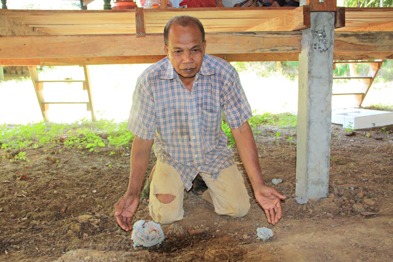 นายรมศักดิ์ กล่าว่า 1-2 วันแรกตนก็ไม่ได้คิดอะไร แต่ก็เห็นว่ามีเห็ดงอกอยู่ใต้ถุนบ้าน 2 ดอก แต่พอเวลาผ่านไป 4-5 วัน เห็ดทั้ง 2 ดอกนี้ก็ยังไม่โรย แต่กลับกลายเปลี่ยนสีเป็นสีเทาคล้ายๆ ก้อนหิน พอลองจับดูก็แข็งเหมือนหิน ทำให้รู้สึกแปลกใจว่าเป็นเห็ดอะไรกันแน่ แต่ก็ยังไม่บอกใคร จะเก็บไว้เพื่อความเป็นสิริมงคล