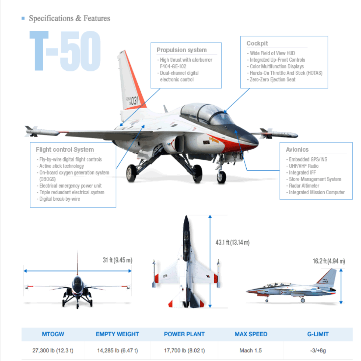 สำหรับ ที-50 มีชื่อเรียกว่า โกลเด้นอีเกิล (T-50 Golden Eagle) หรือ อินทรีทอง เป็นเครื่องบินฝึกขั้นสูงความเร็วเหนือเสียง และเครื่องบินโจมตีเบา ของเกาหลีใต้ ที่ได้รับการพัฒนาขึ้นโดยบริษัทอุตสาหกรรมอวกาศเกาหลี (KAI) ภายใต้ความร่วมมือกับบริษัท ล็อกฮีด มาร์ติน ของสหรัฐอเมริกา ในการออกแบบ และสร้างขึ้น และยังเป็นหนึ่งในเครื่องบินฝึกไม่กี่แบบในโลกที่มีความเร็วเหนือเสีย เริ่มพัฒนาขึ้นในช่วงปี 2540 เป็นต้นมา บินครั้งแรกเมื่อวันที่ 20 สิงหาคม 2545 และเริ่มประจำการในกองทัพอากาศเกาหลีใต้ เมื่อวันที่ 22 กุมภาพันธ์ 2548