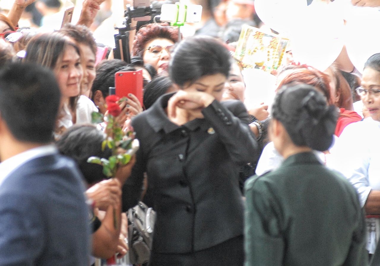 ทันทีที่ น.ส.ยิ่งลักษณ์ เดินทางมาถึง ทั้งประชาชนที่มาให้กำลังใจและกลุ่มสื่อมวลชนไทยและต่างชาติ กรูกันเข้าไปเก็บภาพที่ประชาชนมอบช่อดอกไม้ให้กำลังใจกันอย่างชุลมุน ทำให้ทีมรักษาความปลอดภัยของ น.ส.ยิ่งลักษณ์ ต้องทำงานอย่างหนัก ขณะที่ น.ส.ยิ่งลักษณ์ ยิ้มแย้มแจ่มใส โบกมือทักทาย ยกมือไหว้สวัสดีกับประชาชน ที่เข้ามารอให้กำลังใจหนาตามากกว่าทุกครั้งที่ผ่านมา โดยก่อนที่ น.ส.ยิ่งลักษณ์ จะเข้าสู่ห้องพิจารณาคดี มีประชาชนมอบดอกไม้ให้พร้อมสวมกอด และกล่าวคำพูดให้กำลังใจ ทำเอา น.ส.ยิ่งลักษณ์ กลั้นน้ำตาไว้ไม่อยู่ ยกมือขึ้นปาดน้ำตาด้วยความซาบซึ้งใจ จากนั้น น.ส.ยิ่งลักษณ์ ได้กล่าวกับกลุ่มสื่อมวลชนว่า ขอขอบคุณประชาชนที่เข้ามาให้กำลังใจในวันนี้แต่จะให้สัมภาษณ์หลังการพิจารณาคดีเสร็จสิ้นแล้ว จากนั้นจึงเดินเข้าสู่ห้องพิจารณาคดี