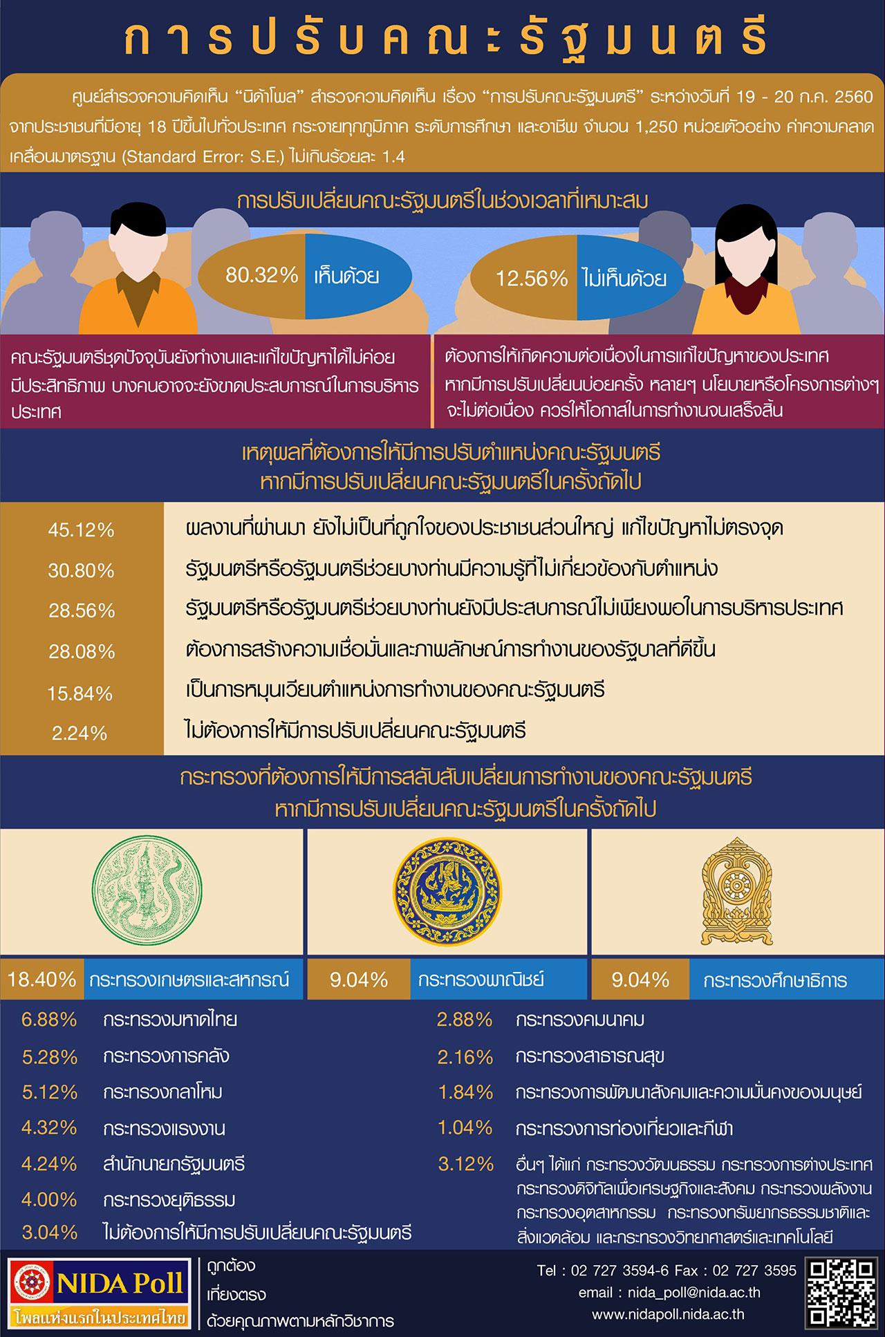 โดยเมื่อถามถึงความคิดเห็นของประชาชน เกี่ยวกับการปรับเปลี่ยนคณะรัฐมนตรี (ครม.) ในช่วงเวลาที่เหมาะสม พบว่า ส่วนใหญ่ ร้อยละ 80.32 ระบุว่า เห็นด้วย เพราะ ครม.ชุดปัจจุบันยังทำงานและแก้ไขปัญหาได้ไม่ค่อยมีประสิทธิภาพ บางคนยังขาดประสบการณ์ในการบริหารประเทศ จึงต้องการเห็นคนใหม่ๆ ที่เหมาะสมกับตำแหน่งเข้ามาทำงาน สร้างผลงานที่เป็นรูปธรรมและชัดเจน มีการเปลี่ยนแปลงของประเทศไปในทิศทางที่ดีขึ้น รองลงมา ร้อยละ 12.56 ระบุว่า ไม่เห็นด้วย เพราะต้องการให้เกิดความต่อเนื่องในการแก้ไขปัญหาของประเทศ หากมีการปรับเปลี่ยนบ่อยครั้ง หลายๆ นโยบายหรือโครงการต่างๆ จะไม่ต่อเนื่อง ควรให้โอกาสในการทำงานจนเสร็จสิ้น บางส่วนระบุว่า ครม.ชุดนี้ทำงานดีอยู่แล้ว อีกทั้ง สถานการณ์และเหตุการณ์บ้านเมืองยังมีความไม่แน่นอน และร้อยละ 0.72 ระบุว่า อื่นๆ ได้แก่ ขึ้นอยู่กับการตัดสินใจของนายกรัฐมนตรี