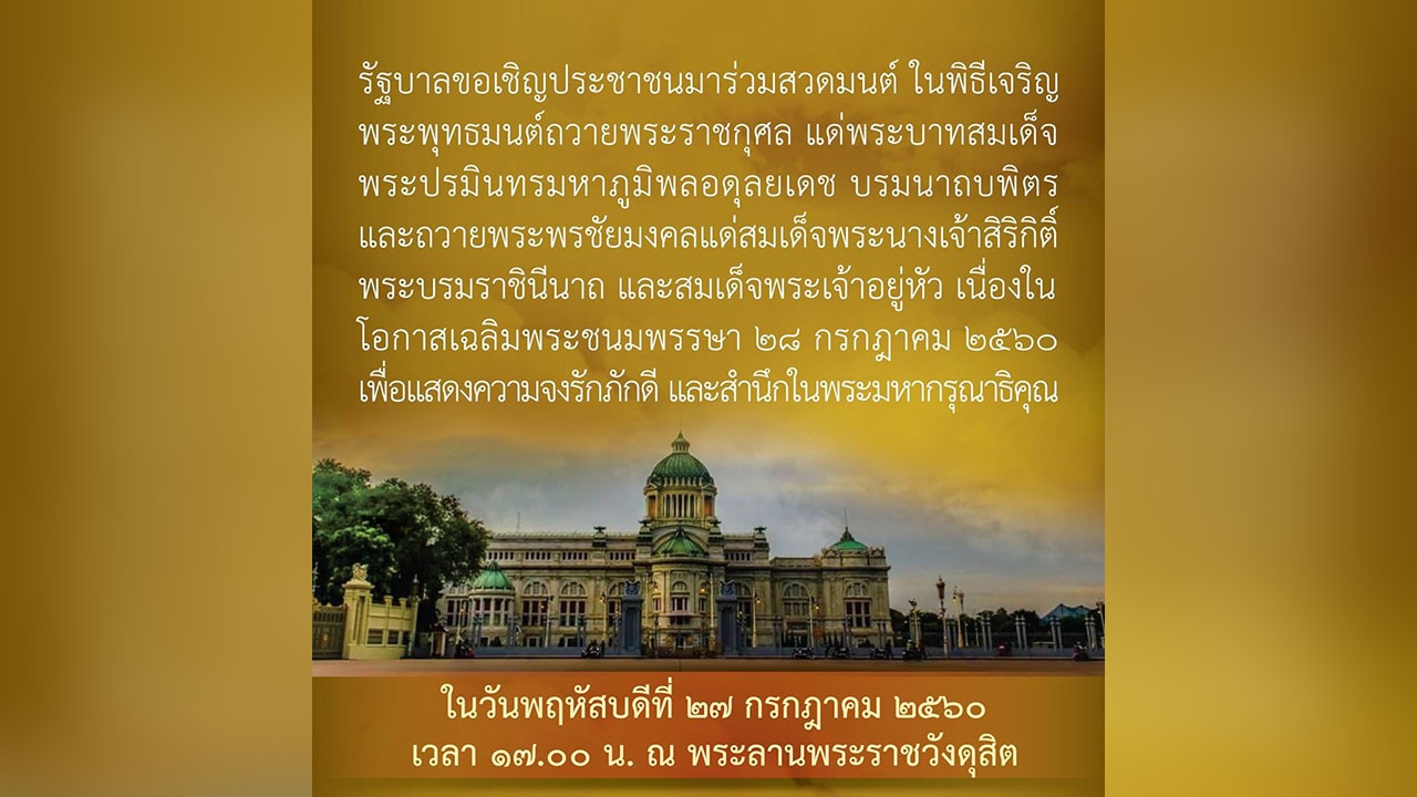 ผู้สื่อข่าวรายงานว่า เมื่อวันที่ 25 ก.ค. เฟซบุ๊กสำนักงานปลัดสำนักนายกรัฐมนตรี (สปน.) เผยแพร่ข้อความว่า รัฐบาลขอเชิญประชาชนมาร่วมสวดมนต์ในพิธีเจริญพระพุทธมนต์ถวายพระราชกุศลแด่พระบาทสมเด็จพระปรมินทรมหาภูมิพลอดุลยเดช และถวายพระพรชัยมงคลแด่สมเด็จพระนางเจ้าสิริกิติ์ พระบรมราชินีนาถ และสมเด็จพระเจ้าอยู่หัว เนื่องในโอกาสเฉลิมพระชนมพรรษา 28 กรกฎาคม 2560 เพื่อแสดงความจงรักภักดี สำนึกในพระมหากรุณาธิคุณ ในวันที่ 27 ก.ค. เวลา 17.00 น. ณ พระลานพระราชวังดุสิต