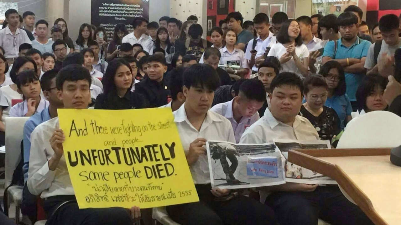 ผู้สื่อข่าวรายงานว่า เมื่อวันที่ 12 ก.ย.60 ที่คณะรัฐศาสตร์ ม.ธรรมศาสตร์ รังสิต มีการจัดงาน "รัฐศาสตร์วิชาการ" โดยเชิญ นายอภิสิทธิ์ เวชชาชีวะ หัวหน้าพรรคประชาธิปัตย์และอดีตนายกรัฐมนตรี กล่าวปาฐกถาพิเศษ หัวข้อ "จากนักวิชาการสู่นายกรัฐมนตรี : ภาพการเมืองที่เปลี่ยนไป" โดยระหว่างการบรรยายนั้น ได้มีกลุ่มนักศึกษาคณะรัฐศาสตร์ ชั้นปีที่ 1 ประมาณ 4 คน นำโดย นายพริษฐ์ ชิวารักษ์ หรือเพนกวิน ที่นั่งอยู่แถวหน้าสุดใกล้กับโพเดียม ที่ นายอภิสิทธิ์ กำลังบรรยายได้ชูป้ายที่เขียนข้อความว่า "...unfortunately, some people died อภิสิทธิ์ เวชชาชีวะ ให้สัมภาษณ์เมื่อปี 2555" ส่วนทางด้าน นายอภิสิทธิ์ ก็ดำเนินการบรรยายต่อไปอย่างเรียบเฉย ไม่มีท่าทีต่อการแสดออกของนักศึกษาแต่อย่างใด