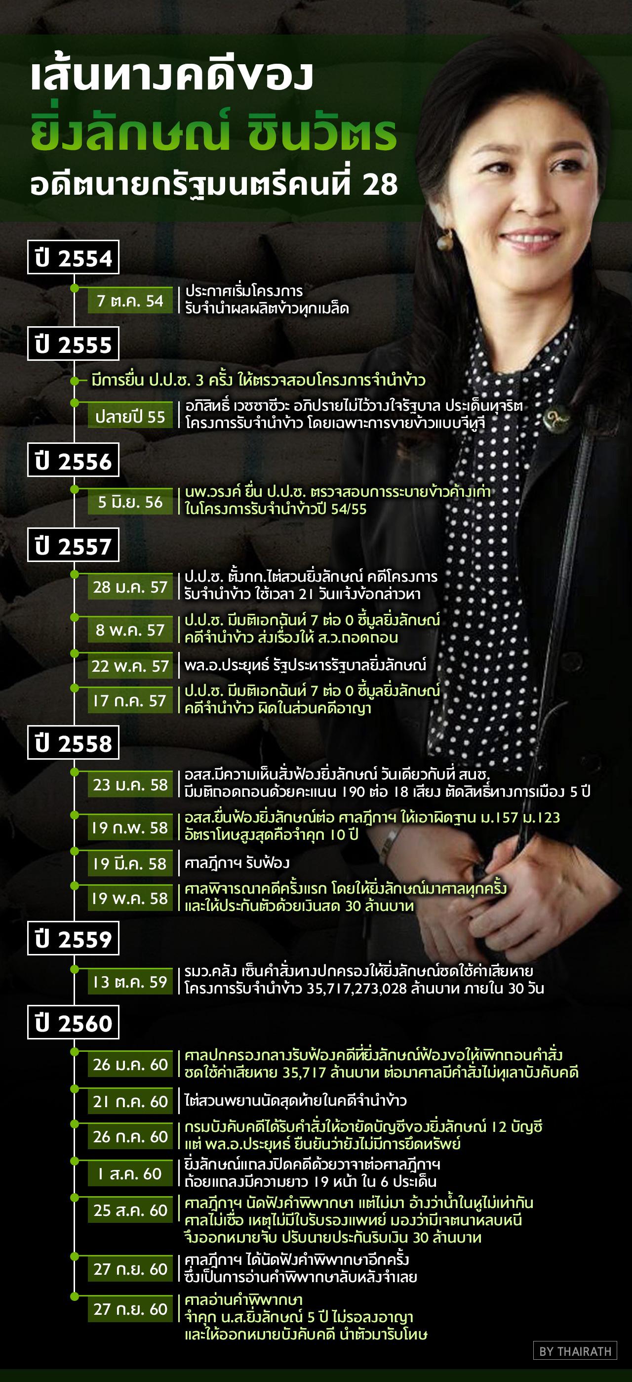ไทยรัฐออนไลน์รวบรวมเส้นทางคดีจำนำข้าว ซึ่ง น.ส.ยิ่งลักษณ์ ชินวัตร ตกเป็นจำเลยในคดีปล่อยปละละเลยให้เกิดการทุจริต ล่าสุด ศาลฎีกาฯ พิพากษาให้จำคุก 5 ปี...
