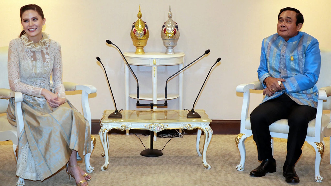 น.ส.มารีญา พูลเลิศลาภ มิสยูนิเวิร์สไทยแลนด์ 2017 ไหว้ขอบคุณ พล.อ.ประยุทธ์ จันทร์โอชา นายกฯและหัวหน้า คสช. ที่มอบกระเช้าสุขภาพจากสินค้าโอทอปให้ขณะเข้าพบที่ทำเนียบรัฐบาล โดยนายกฯกล่าวขอบคุณที่สร้างความสุขให้คนไทย พร้อมทาบทามให้มาช่วยงานรัฐบาล.