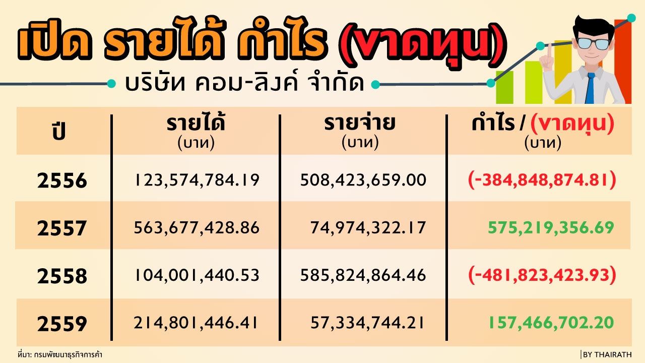 สำหรับรายได้และกำไรของคอม-ลิงค์ ที่รายงานต่อกรมพัฒนาธุรกิจการค้า ย้อนหลังไป 4 ปี ช่วงปี 2556-2559 พบว่าสลับปีทำกำไร และขาดทุน อย่างปี 2556 มีรายได้ประมาณ 123.57 ล้านบาท แต่มีรายจ่ายประมาณ 508.42 ล้านบาท จึงขาดทุนประมาณ 384.84 ล้านบาท ส่วนปี 2557 ปีที่ คสช.เริ่มเข้ามาบริหารประเทศ มีรายได้สูงถึงประมาณ 563.67 ล้านบาท รายจ่ายเพียง 74.97 ล้านบาท กำไรปีนั้นสูงถึง 575.21 ล้านบาท ส่วนปี 2558 กลับมีผลประกอบการขาดทุนอีก เพราะรายได้เพียง 104 ล้านบาท มีรายจ่ายถึง 585.82 ล้านบาท ขาดทุน 481.82 ล้านบาท และปี 2559 กลับมามีกำไรอีกครั้ง ด้วยตัวเลข 157.46 ล้านบาท เพราะรายได้ 214.80 ล้านบาท ส่วนรายจ่ายมีเพียง 57.33 ล้านบาท.