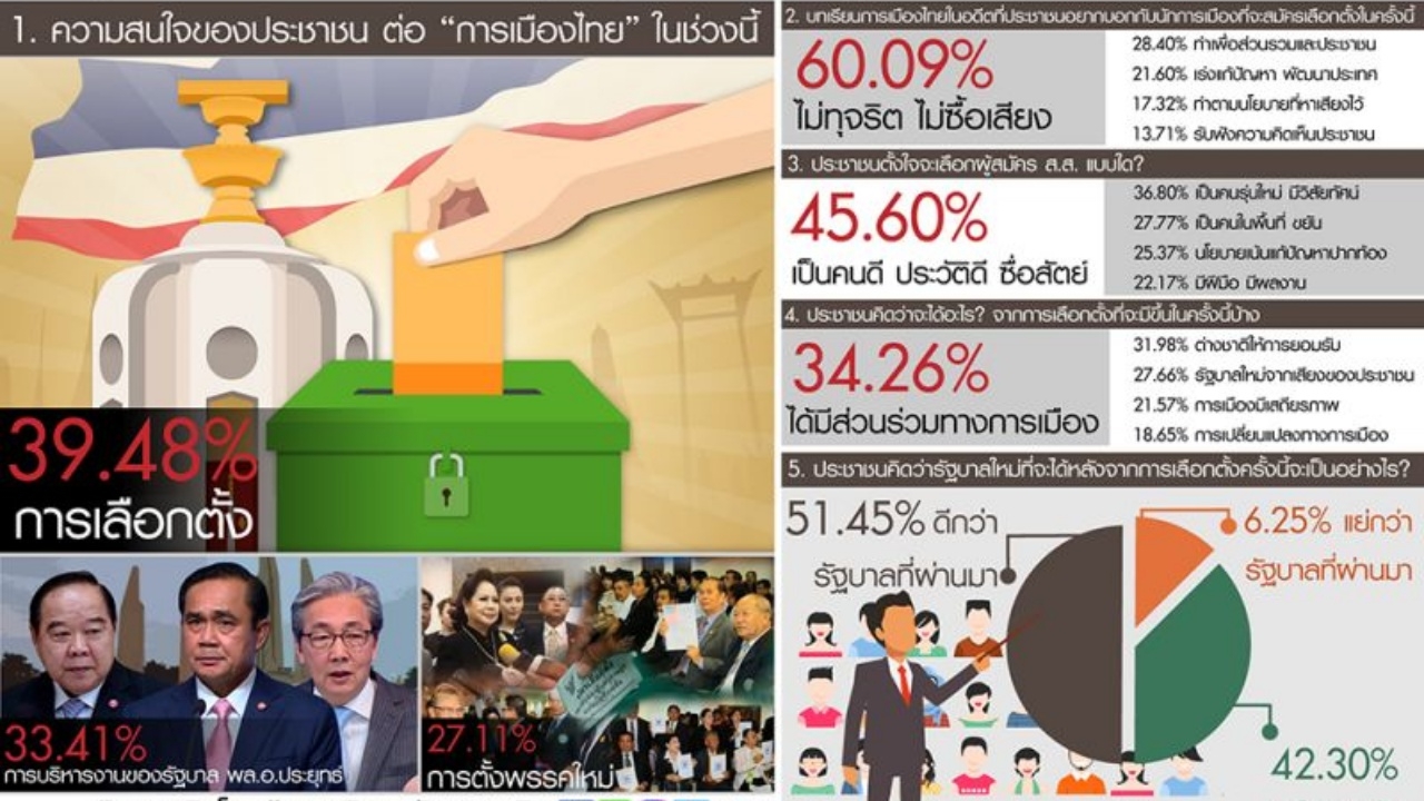 สวนดุสิตโพล เผยคนส่วนใหญ่สนใจการเมือง เพราะอยากให้เลือกตั้ง ต้องการนักการเมืองซื่อสัตย์ ไม่ทุจริต ซื้อเสียง เชื่อรัฐบาลใหม่ จะดีกว่าที่ผ่านมา เพราะมาจากเลือกตั้ง เป็นตัวแทนประชาชน...