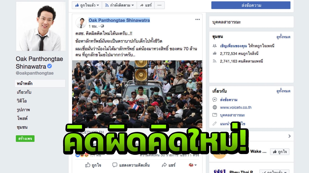 วันที่ 19 มิ.ย. นายพานทองแท้ ชินวัตร บุตรชาย นายทักษิณ ชินวัตร อดีตนายกรัฐมนตรี โพสต์เฟซบุ๊กส่วนตัว Oak Panthongtae Shinawatra ข้อความ คสช. คิดผิดคิดใหม่ได้นะครับ..!! ข้อหาลักทรัพย์มันจะเป็นตราบาปกับเด็กไปทั้งชีวิต ผมเชื่อมั่นว่า น้องไม่ได้มาลักทรัพย์ แต่น้องมาทวงสิทธิ์ของคน 70 ล้านคน ที่ถูกลักขโมยไปมากกว่าครับ