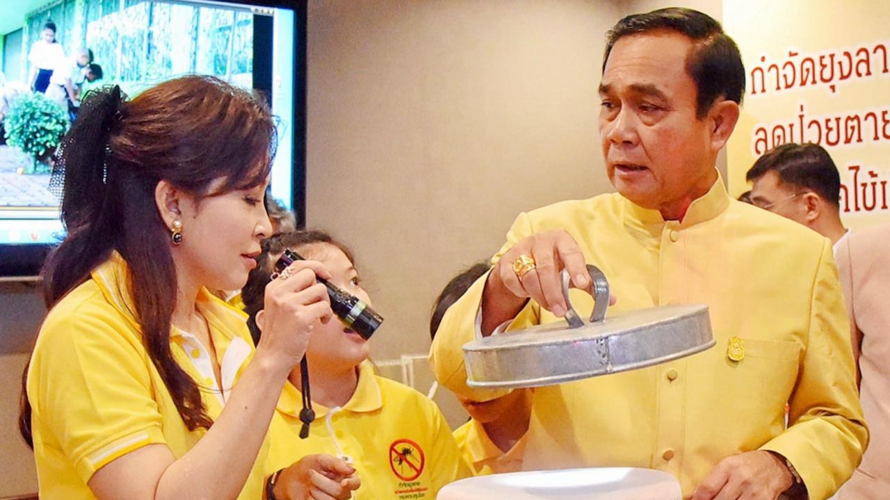 เมื่อวันที่ 27 มิ.ย.61 ที่ทำเนียบรัฐบาล พล.อ.ประยุทธ์ จันทร์โอชา นายกรัฐมนตรีและหัวหน้าคณะรักษาความสงบแห่งชาติ (คสช.) เป็นประธานการประชุมคณะรัฐมนตรี (ครม.) โดยก่อนการประชุม ที่บริเวณโถงกลางตึกบัญชาการ 1 นพ.ปิยะสกล สกลสัตยาทร รมว.สาธารณสุข (สธ.) นำคณะเข้าพบนายกฯ เพื่อจัดแสดงนิทรรศการรณรงค์ "กำจัดลูกน้ำยุงลาย ลดป่วยตายด้วยโรคไข้เลือดออก" โดยมี "กวาง" กมลชนก เขมะโยธิน ดารานักแสดงร่วมรณรงค์ ขณะที่นายกฯ ได้สอบถามสถานการณ์ พร้อมกำชับการควบคุมการแพร่ระบาดยุงลาย จากนั้นนายกฯ ดูคิวอาร์โค้ดที่มีข้อมูลให้ประชาชนสามารถเข้าไปดูวิธีการป้องกัน และชมวิดีโอการรณรงค์พิชิตยุงลาย พร้อมกล่าวว่า ให้นำวิดีโอนี้ไปเผยแพร่ทางกรมประชาสัมพันธ์และสถานีโทรทัศน์ต่างๆ อยากให้สนใจเรื่องที่เป็นประโยชน์อย่างนี้บ้าง และนายกฯ ยังร่วมกิจกรรมใช้ไฟฉายส่องหาลูกน้ำ พร้อมใส่ทรายอะเบท พร้อมฉีดสเปรย์ตะไคร้หอมป้องกันยุงมายังผู้สื่อข่าว พร้อมกล่าวว่า "ยุงรำคาญ ต้องหันไปทางนี้ ไม่อันตรายหรอก แต่รำคาญ ไม่รู้อะไรเหมือนกัน"