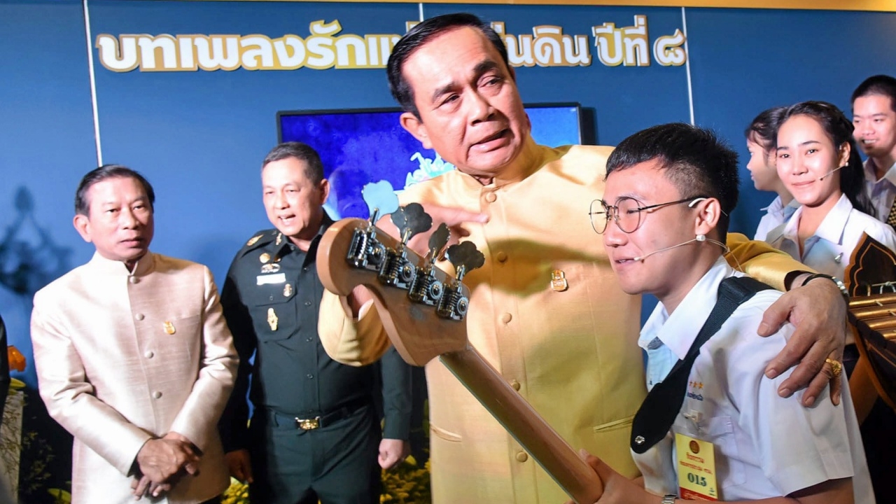 จากนั้น พล.อ.วีรชัย อินทุโศภน ผู้ช่วยผู้บัญชาการทหารบก นำคณะเข้าพบนายกฯ เพื่อจัดแสดงนิทรรศการตามโครงการบทเพลงรักแห่งแผ่นดิน ปีที่ 8 "อุ่นใจใต้ร่มพระบารมี" และนายกฯ ได้ลงนามบนถ้วยรางวัลถ้วยรางวัลเกียรติยศประเภทประชาชนทั่วไป เพื่อนำไปใช้ในโครงการ ขณะที่นักเรียนโรงเรียนเตรียมอุดมศึกษา ที่ชนะการแข่งขันในโครงการฯ ปีที่ 7 ได้ร้องเพลงและบรรเลงบทเพลงรักแห่งแผ่นดิน จากนั้น นายกิตตินันท์ ชินสำราญ หรือกิต เดอะวอยซ์ ขับร้องเพลง "สยามินทร์ราชามหาวชิราลงกรณ" โดยนายกฯ กล่าวว่า บทเพลงนี้มีความหมายดี โดยเฉพาะในช่วงเวลานี้คือ ส่ิงที่พระองค์ท่านรัชกาลที่ 9 เริ่มไว้ทั้งหมด ซึ่งรัชกาลที่ 10 ทรงต่อยอดสืบสานรักษาไว้ เป็นสิ่งที่ประเทศไทยเราไม่เหมือนประเทศอื่น ไปไหนตนภูมิใจ ไปต่างประเทศตนก็พูดกับเขาถึงหลักปรัชญาเศรษฐกิจพอเพียง