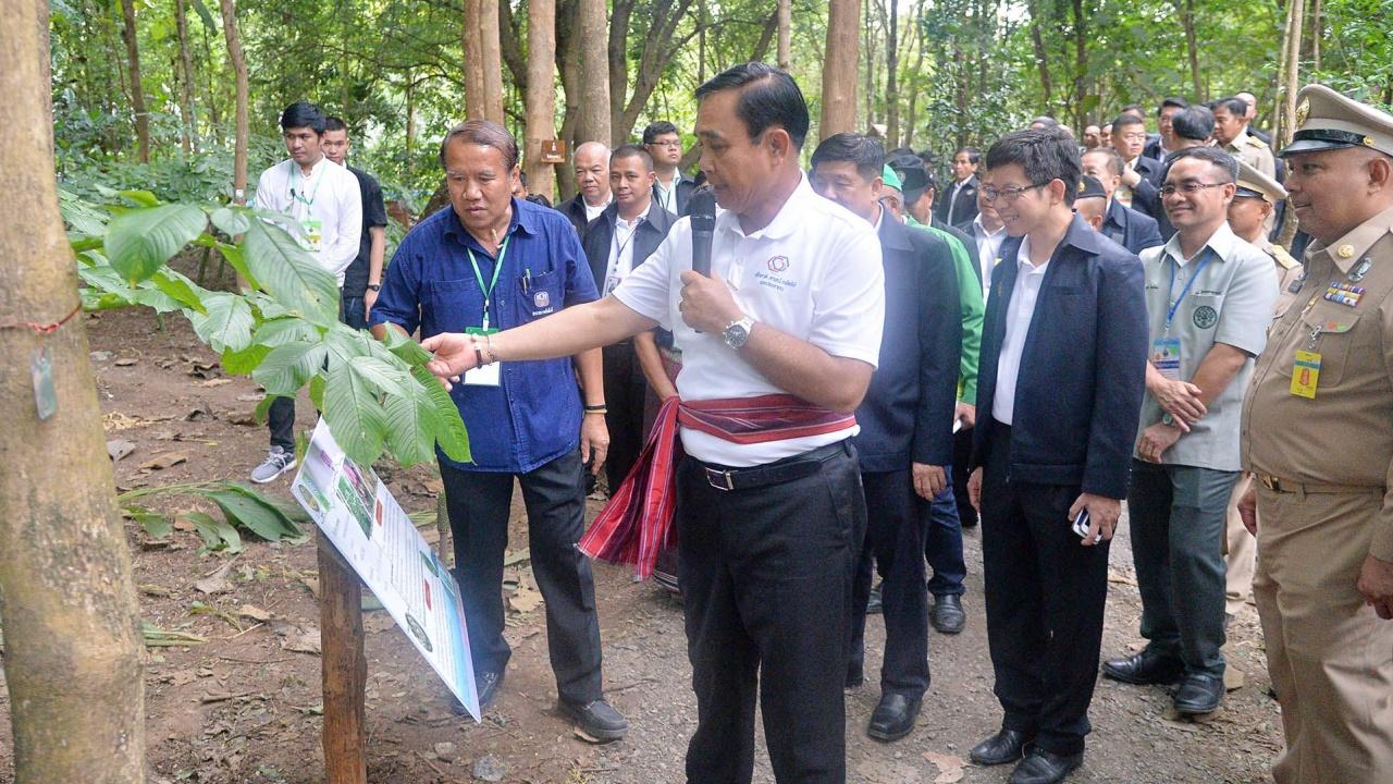 เมื่อวันที่ 17 ก.ย.61 พล.อ.ประยุทธ์ จันทร์โอชา นายกรัฐมนตรีและหัวหน้าคณะรักษาความสงบแห่งชาติ (คสช.) พร้อมคณะ เดินทางมายังสวนป่าเกษตรห้วยแสนคำ ต.บ้านหวาย อ.หล่มสัก จ.เพชรบูรณ์ เพื่อเยี่ยมชมการปลูกไม้มีค่าทางเศรษฐกิจ โดยเจ้าหน้าที่ได้อธิบายถึงการประเมินมูลค่าไม้มีค่าที่สามารถนำไปเป็นหลักประกันกู้เงินจากธนาคารได้ เช่น ต้นสักทอง ต้นมะฮอกกานี ต้นประดู่ และต้นมะขาม เป็นต้น