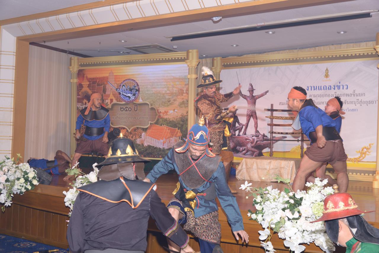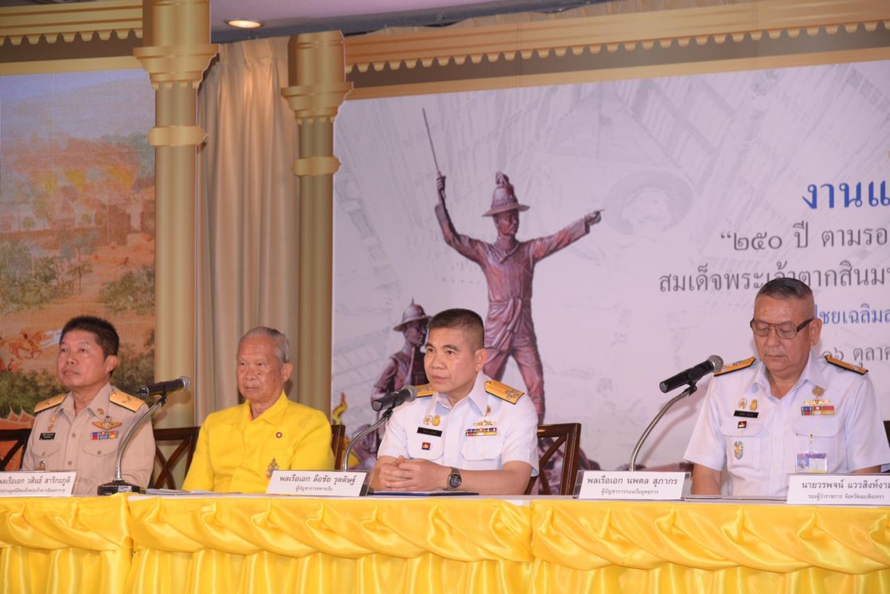 เมื่อวันที่ 16 ต.ค.61 กองทัพเรือ ได้จัดให้มีการแถลงข่าว การจัดงาน “250 ปี ตามรอย กองเรือยกพลขึ้นบก สมเด็จพระเจ้าตากสินมหาราช จากจันทบุรี สู่อยุธยา” ที่อาคารราชนาวิกสภา ห้องวุฒิไชยเฉลิมลาภ โดยมี พล.ร.อ.ลือชัย รุดดิษฐ์ ผู้บัญชาการทหารเรือ เป็นประธานการแถลงข่าว มีผู้ร่วมแถลงข่าว ประกอบด้วย พล.ร.อ.นพดล สุภากร ผู้บัญชาการกองเรือยุทธการ พล.ร.อ.วสินธ์ สาริกะภูติ ประธานมูลนิธิสมเด็จพระเจ้าตากสินมหาราช นายวิทูรัช ศรีนาม ผู้ว่าราชการจังหวัดจันทบุรี นายศุภมิตร ชิณศรี รองผู้ว่าราชการจังหวัดตราด นายธีรวัฒน์ สุดสุข รองผู้ว่าราชการจังหวัดระยอง นายภัครธรณ์ เทียนไชย ผู้ว่าราชการจังหวัดชลบุรี นายวรพจน์ แววสิงห์งาม รองผู้ว่าราชการจังหวัดฉะเชิงเทรา นาวศิวภรณ์ ฉั่วสวัสดิ์ รองผู้ว่าการจังหวัดสมุทรปราการ นายทวีศักดิ์ เลิศประพันธ์ รองผู้ว่าราชการกรุงเทพมหานคร นายภานุ แย้มศรี ผู้ว่าราชการจังหวัดนนทบุรี นายผล ดำธรรม ผู้ว่าราชการจังหวัดปทุมธานี และ นายสัมฤทธิ์ กองเงิน หัวหน้าสำนักงานจังหวัดพระนครศรีอยุธยา