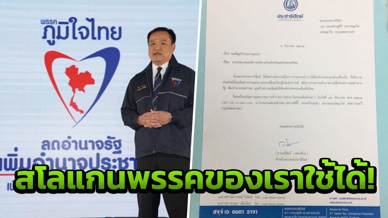 ลอกไม่ลอก!!! แนวคิดประชาธิปัตย์ตรงสโลแกนพรรคภูมิใจไทย “ลดอำนาจรัฐ เพิ่มอำนาจประชาชน” โฆษกภูมิใจไทยขอบคุณ "อภิสิทธิ์" หยิบไปใช้ มั่นใจเป็นรัฐบาลแก้ปัญหาปากท้อง–สร้างรายได้สำเร็จ