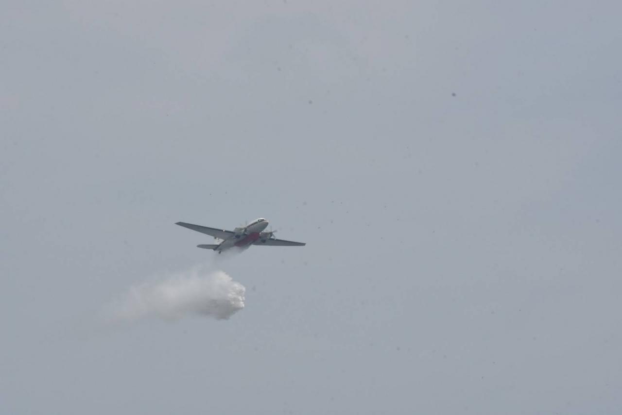 ผู้สื่อข่าวรายงานว่า หลังเสร็จสิ้นการประชุมเจ้าหน้าที่ได้พาสื่อมวลชนดูการเตรียมความพร้อมของเครื่องบินที่จะปฏิบัติภารกิจโปรยละอองน้ำ ลานจอดเครื่องบิน กองทัพอากาศ โดยมีการสาธิตการเติมน้ำลงถังใต้เครื่อง จากนั้นได้พาสื่อมวลชนติดตามดูการปฏิบัติภารกิจบริเวณดาดฟ้าของ รพ.ภูมิพล ใช้เวลาประมาณ 10 นาที ภารกิจในการโปรยละอองน้ำจุดแรกเสร็จสิ้นลง.